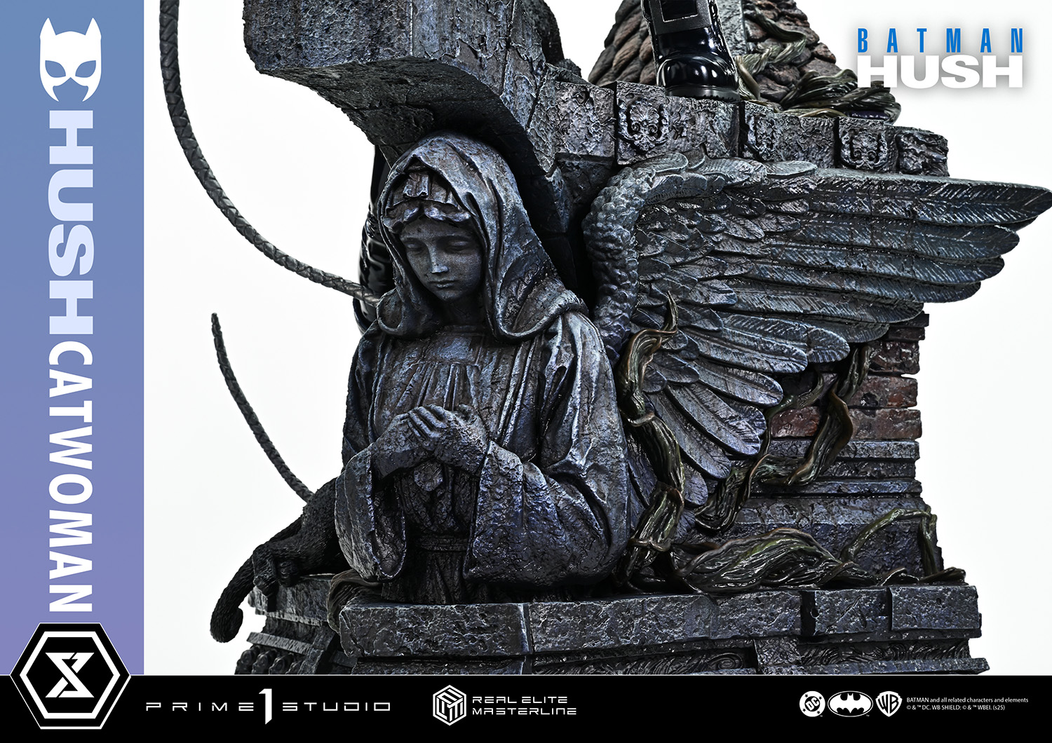 The specially designed base is a work of art in itself. A winged angel statue, a pair of cats at her side, and hidden treasures beneath the brickwork—all motifs that reflect her character within Gotham’s architecture.