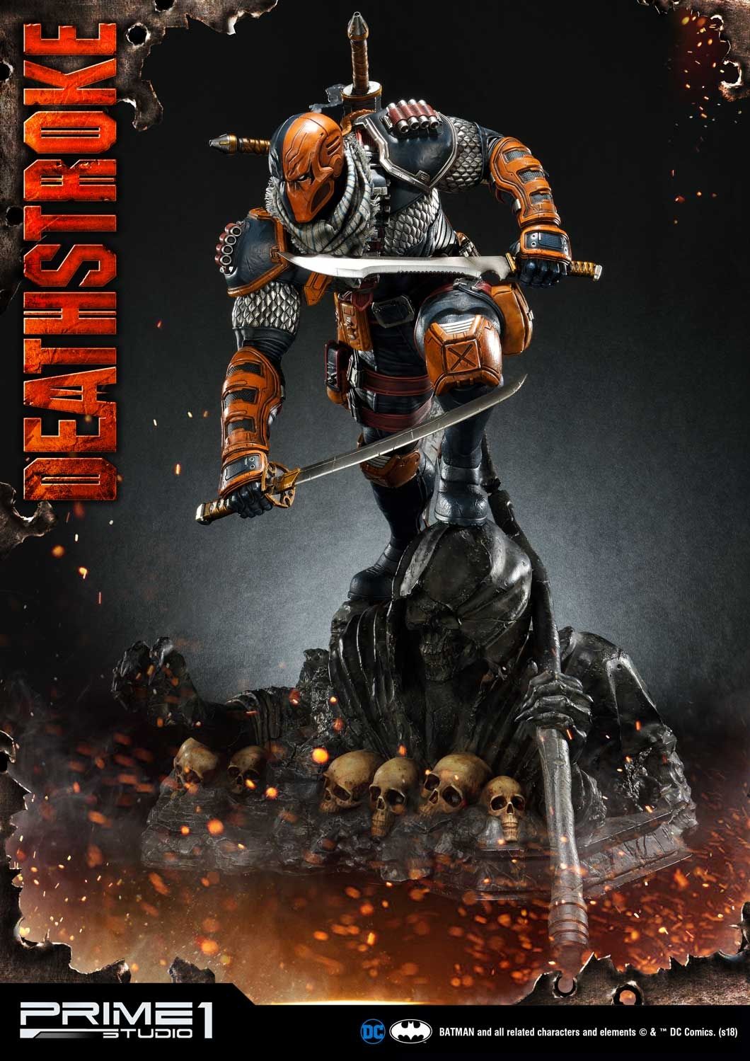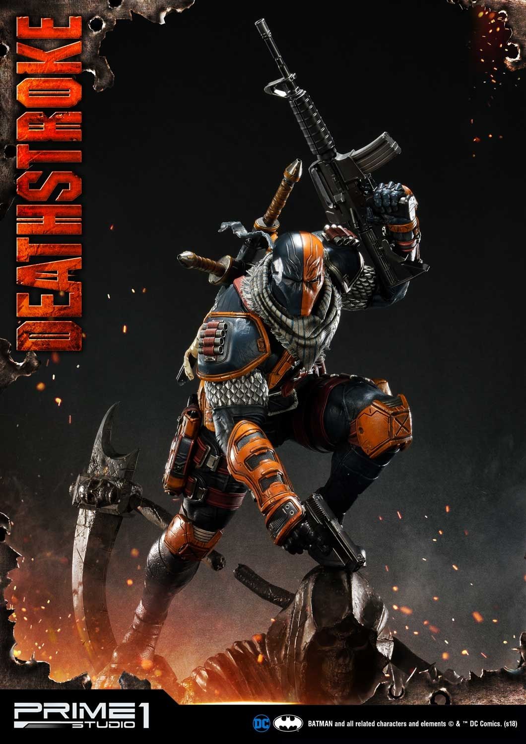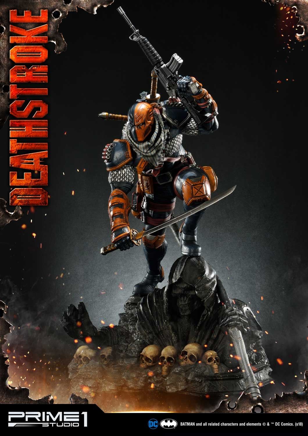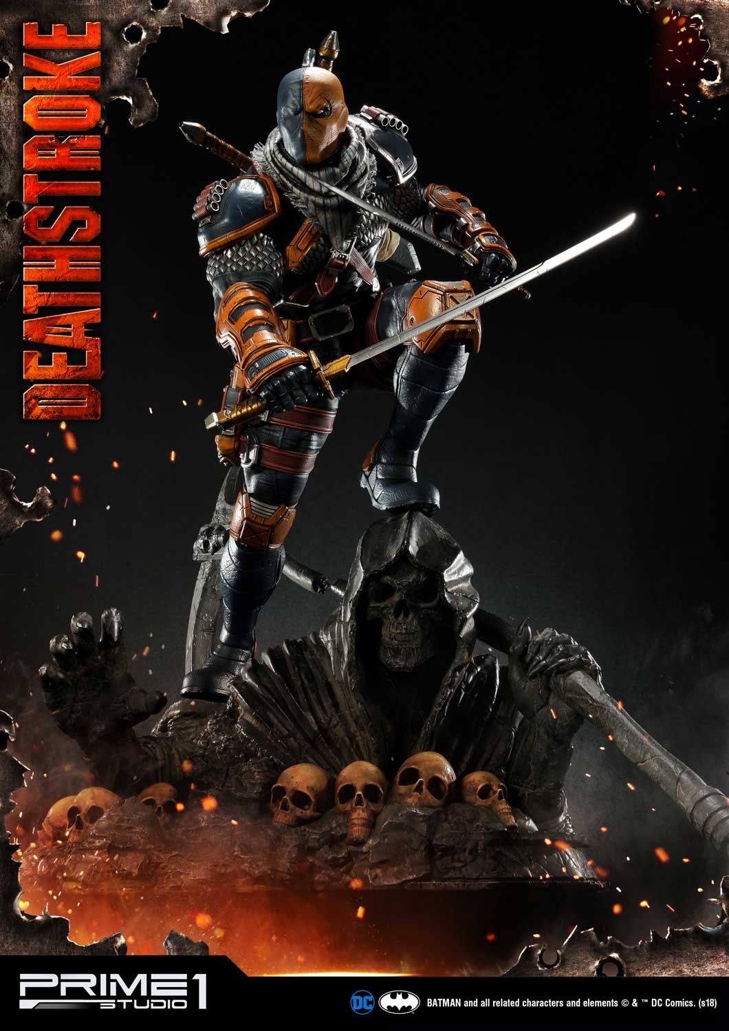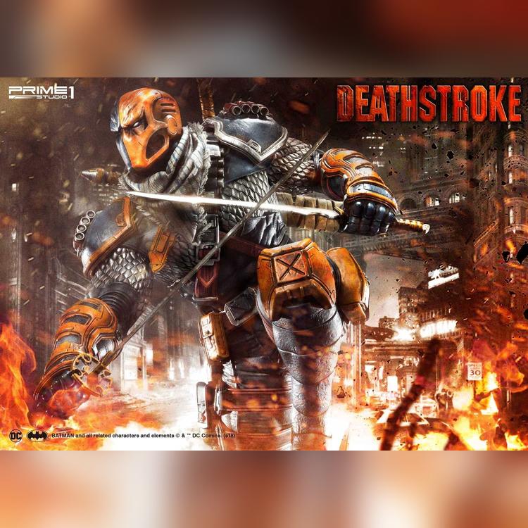 Prime 1 Studio is proud to present 1/3 scale MMDC-30: Deathstroke from DC Comics Universe. Part of an experimental super-soldier program where he gained enhanced strength, agility, healing factor and intelligence. Deathstroke became a mercenary soon and rapidly gained a reputation as one of the world's greatest assassins. In this comic version Deathstroke statue, you have more weapon options to choose such as right hand with Samurai sword or handgun and left hand with a sword or M4 Rifle. As more arm options, it’s able to switch out to several kinds of poses as you like. For the head part, it comes with 2 alternate portraits both mask his ugly face. There is one more alternate portrait coming in the Exclusive version only, the mast with Half skull and Half mask. Deathstroke is standing under a Grim Reaper base design. DC fans, don't miss your chance to own this Deadstroke in your collection!!