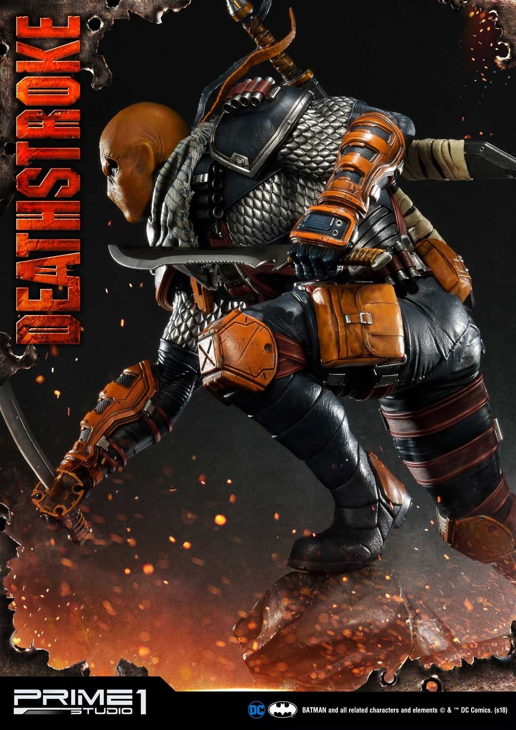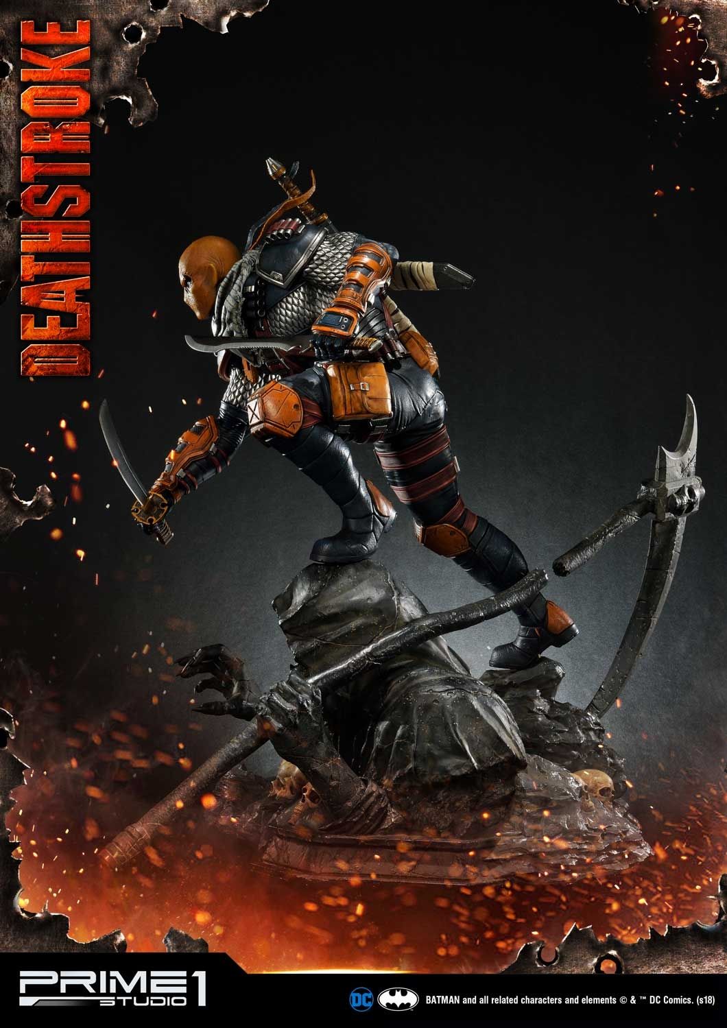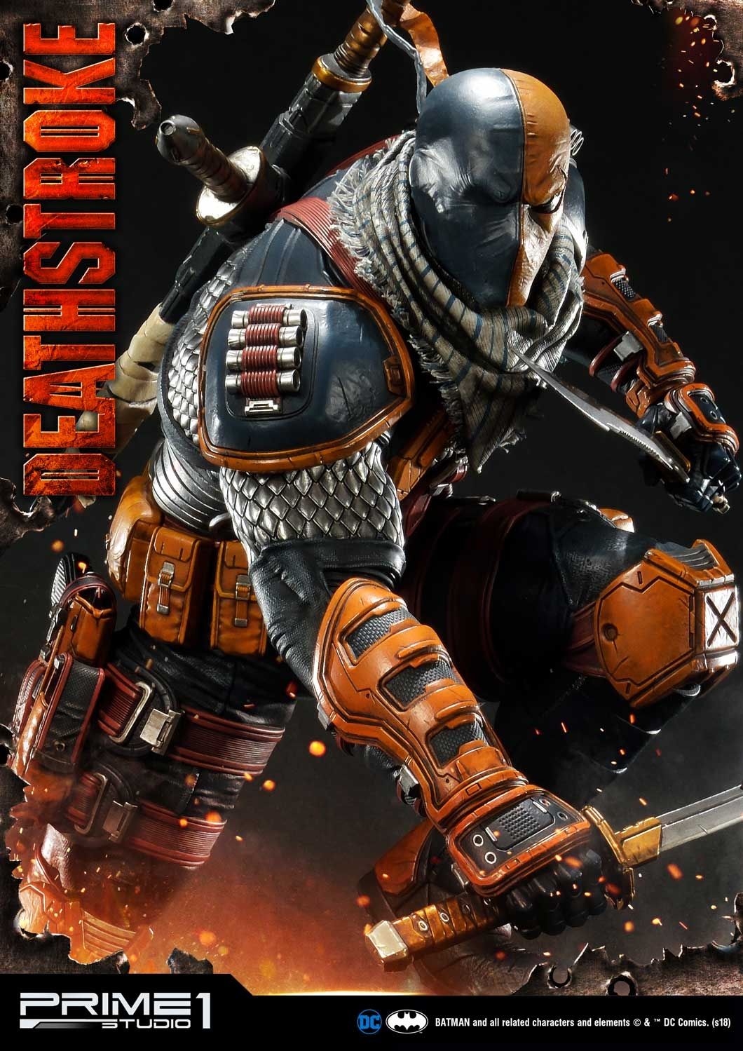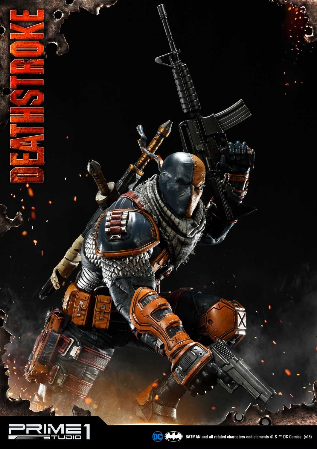 Prime 1 Studio is proud to present 1/3 scale MMDC-30: Deathstroke from DC Comics Universe. Part of an experimental super-soldier program where he gained enhanced strength, agility, healing factor and intelligence. Deathstroke became a mercenary soon and rapidly gained a reputation as one of the world's greatest assassins. In this comic version Deathstroke statue, you have more weapon options to choose such as right hand with Samurai sword or handgun and left hand with a sword or M4 Rifle. As more arm options, it’s able to switch out to several kinds of poses as you like. For the head part, it comes with 2 alternate portraits both mask his ugly face. There is one more alternate portrait coming in the Exclusive version only, the mast with Half skull and Half mask. Deathstroke is standing under a Grim Reaper base design. DC fans, don't miss your chance to own this Deadstroke in your collection!!