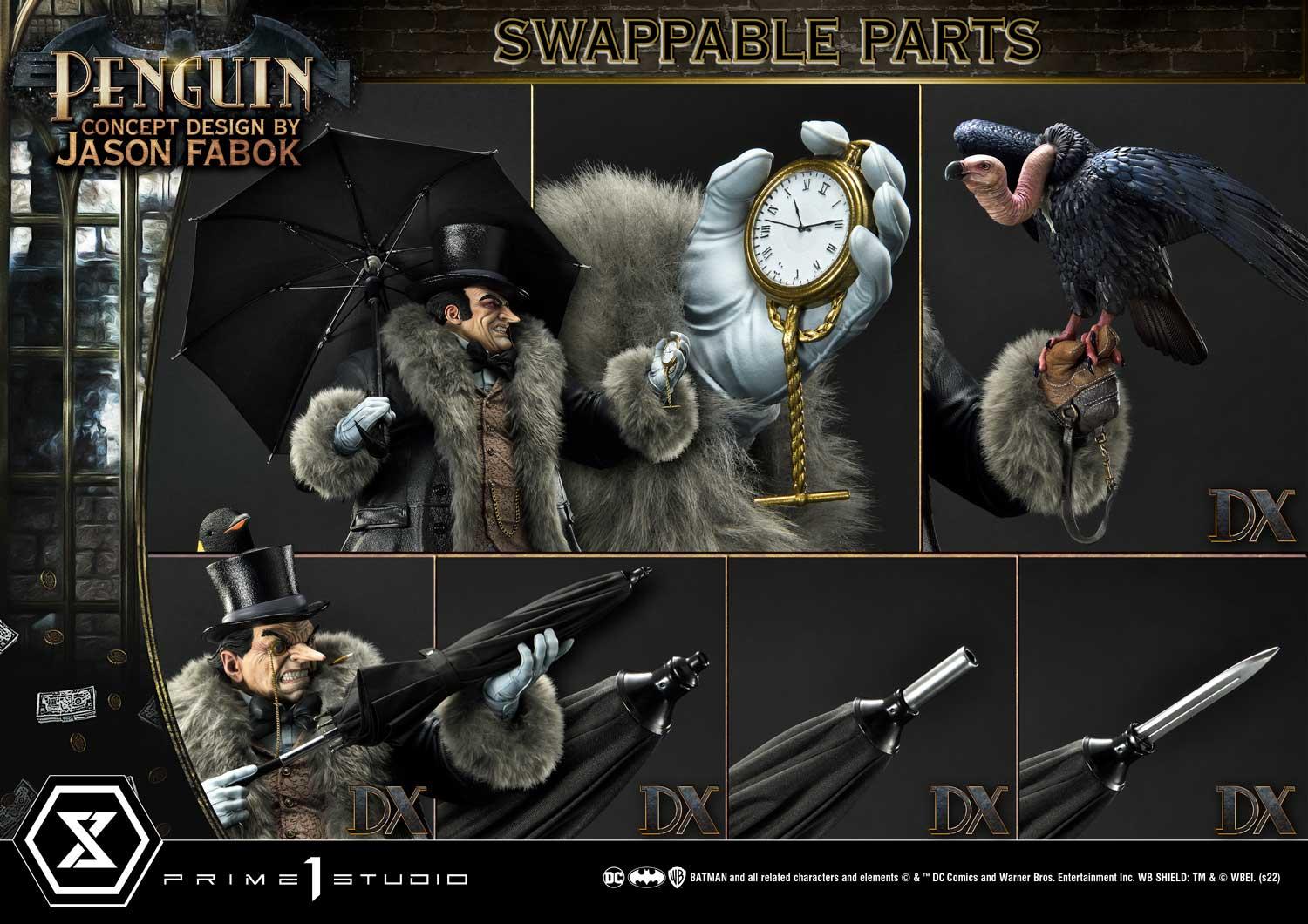 This Deluxe Bonus Version is replete with a wealth of swappable parts: three (3) swappable heads (including one (1) Jason Fabok version of a familiar look from the films), three (3) swappable left hands (including a Vulture!), two (2) swappable right hands, and three (3) swappable umbrella tips! Not only that, Pre-Order this Deluxe Bonus Version from our official online store or any authorized distributor, and will you receive one (1) extra Bonus Swappable Head: a serious Oswald Cobblepot, alternate look, sans his iconic top hat!