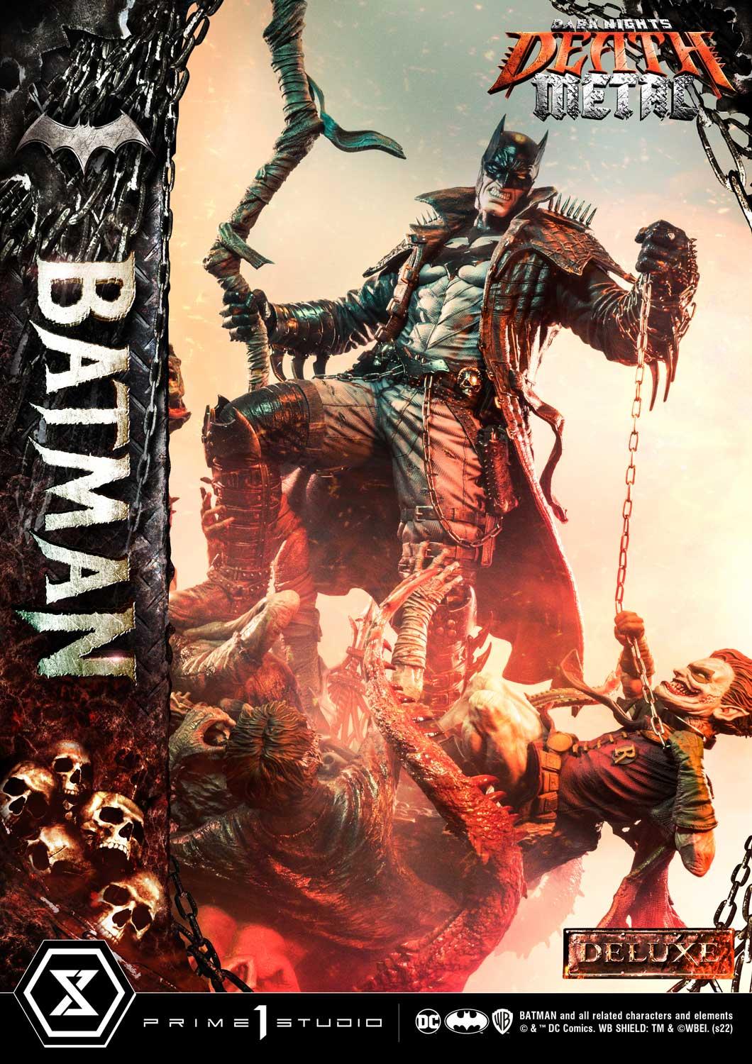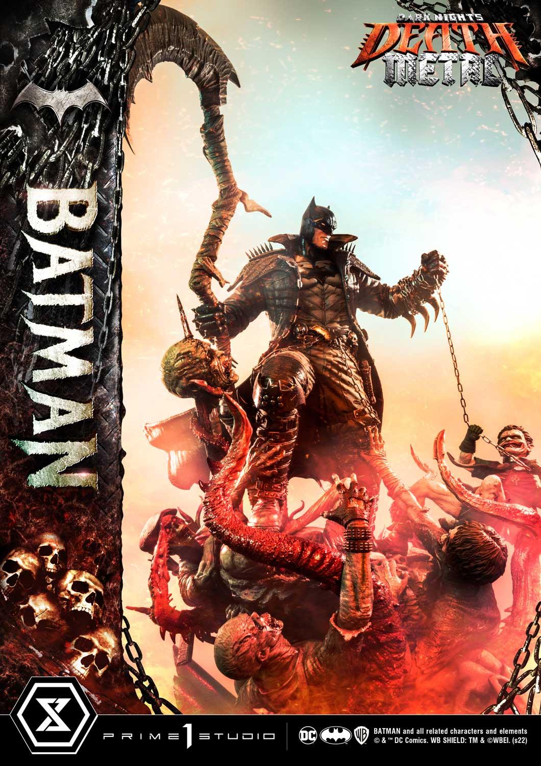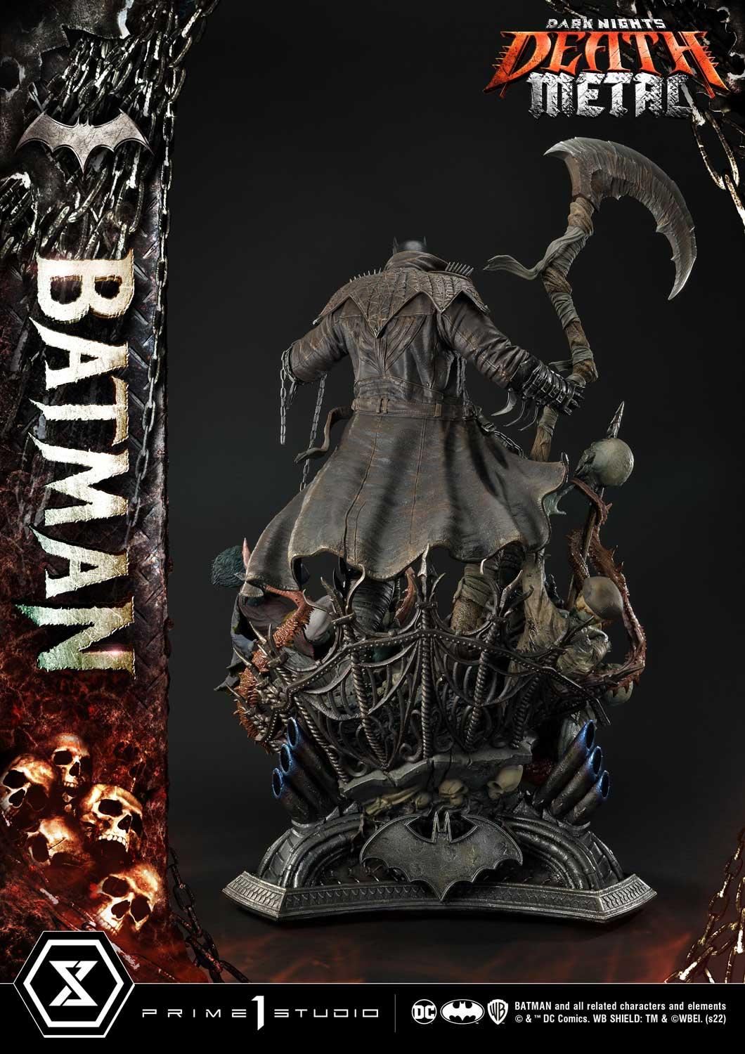 Prime 1 Studio has crafted a Batman at his most dangerous! At a commanding 41 inches tall, he has shed every pretense of subtlety! Batman has covered himself in a grungy, bat-like leather trench coat with over large shoulder spikes, solid metal bracers with razor-sharp fins and an industrial strength utility belt chained to the toughest-looking, butt-kicking boots! In the books, his trench coat grants Batman the power to cloak himself from detection. The Dark Knight has taken it upon himself to become a post-apocalyptic Grim Reaper by wielding a giant scythe as his signature weapon! Most of all, he has found himself the owner of a powerful Black Lantern ring, allowing him to command an inexhaustible supply of reanimated corpses: his Undead Army!