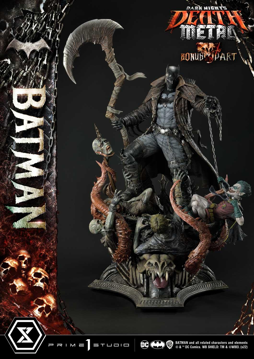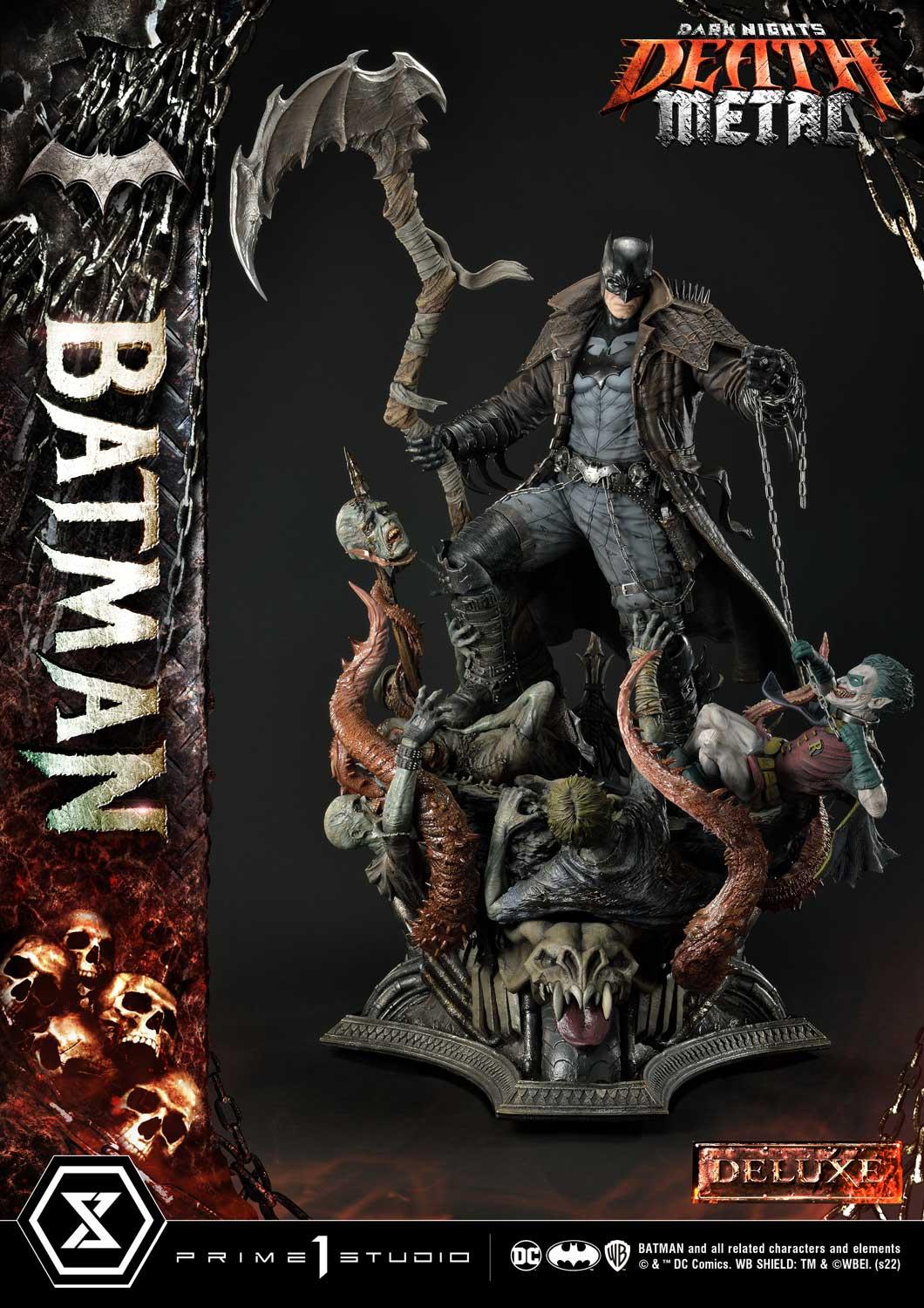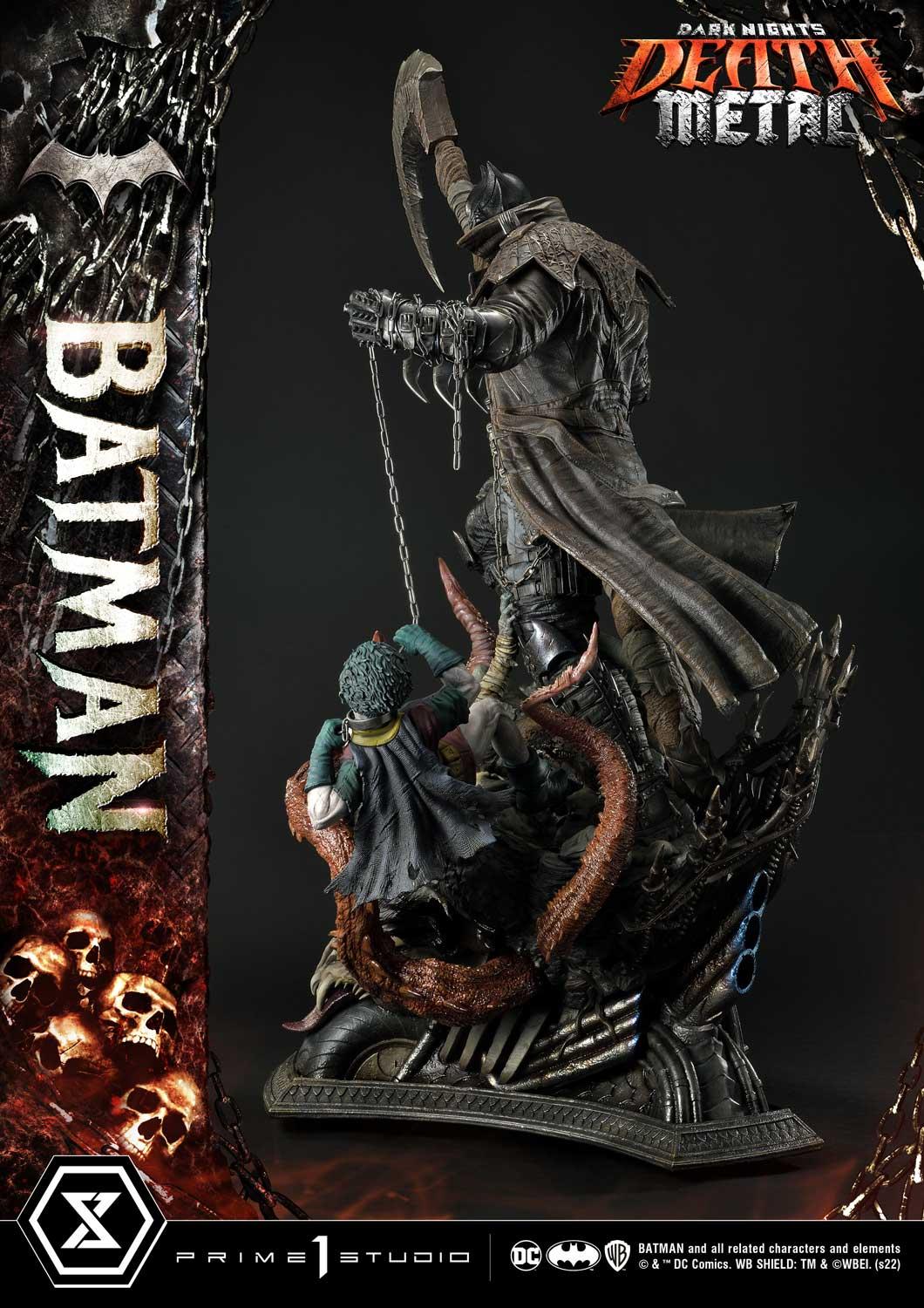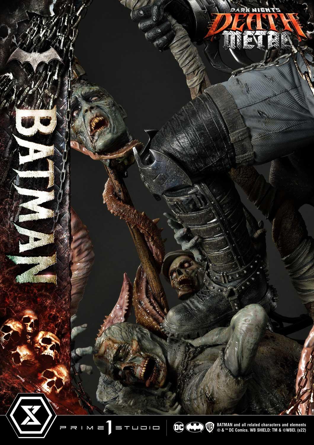 Prime 1 Studio has crafted a Batman at his most dangerous! At a commanding 41 inches tall, he has shed every pretense of subtlety! Batman has covered himself in a grungy, bat-like leather trench coat with over large shoulder spikes, solid metal bracers with razor-sharp fins and an industrial strength utility belt chained to the toughest-looking, butt-kicking boots! In the books, his trench coat grants Batman the power to cloak himself from detection. The Dark Knight has taken it upon himself to become a post-apocalyptic Grim Reaper by wielding a giant scythe as his signature weapon! Most of all, he has found himself the owner of a powerful Black Lantern ring, allowing him to command an inexhaustible supply of reanimated corpses: his Undead Army!