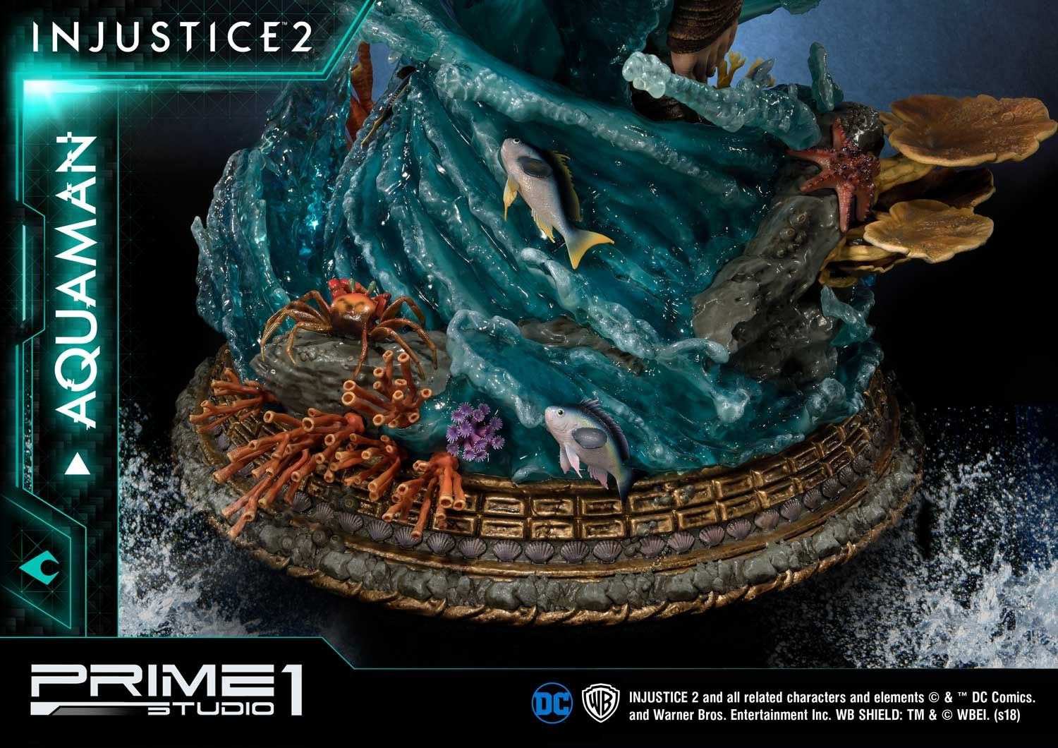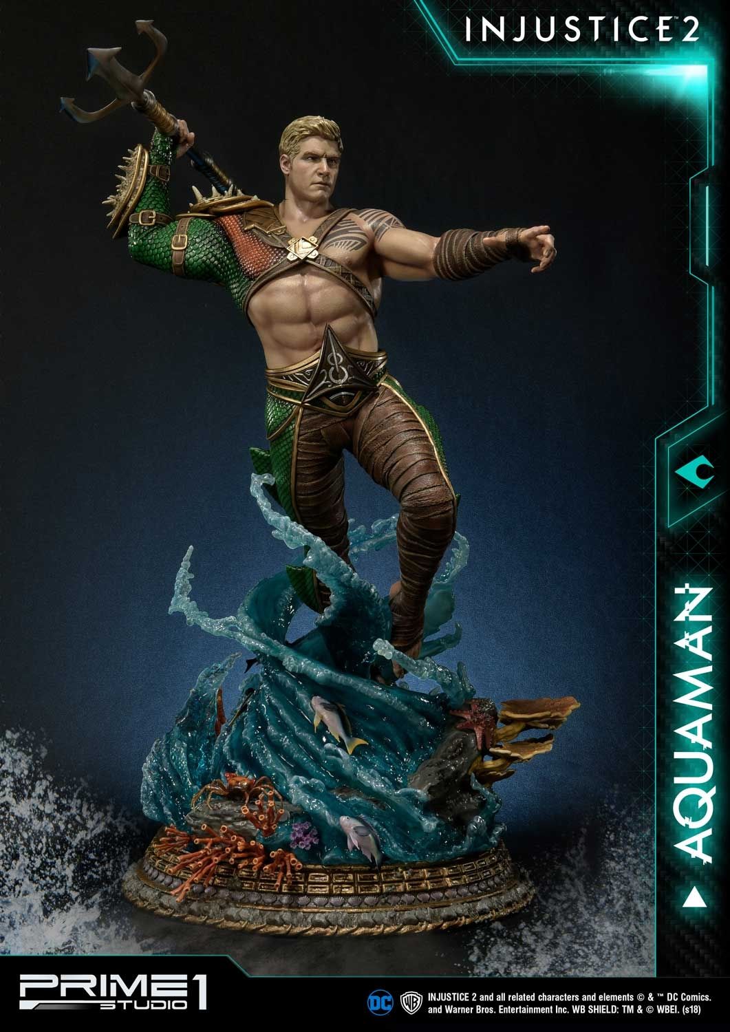 Prime 1 Studio is proud to present 1/4 Scale PMDCIJ-01: Aquaman from Injustice 2. Injustice 2 is a fighting game that is a sequel to Injustice: Gods Among Us. It was released by NetherRealm Studios, known for creating the recent Mortal Kombat games. There are 28 base game characters, with 9 DLC and 16 new playable characters. Arthur Curry, also known as Orin Atlanson, was born a Human/Atlantean hybrid in the simple town of Amnesty Bay. He’s also credited as a founding member of the Justice League of America. Since the Justice League’s Superman had defeated the One Earth Regime’s High Councillor Superman, Batman and his Insurgency have been working to piece back together the world. This Hasn’t been easy as they had to deal with remnants of the Regime, a new villain group called “The Society”, and the arrival of Brainiac.