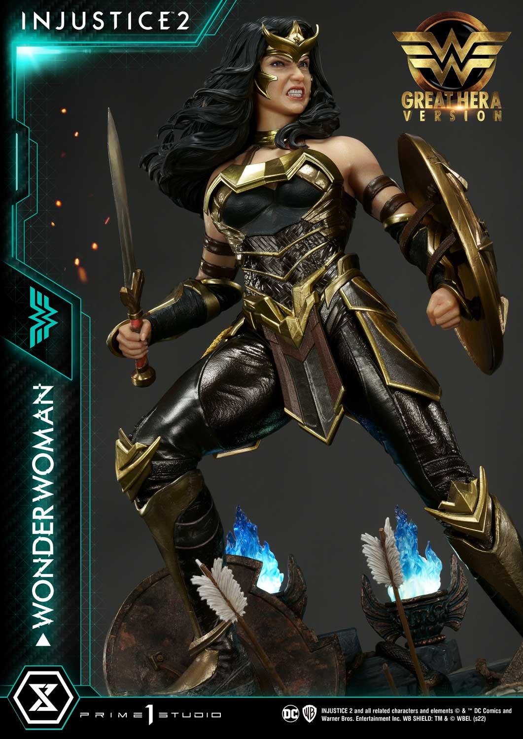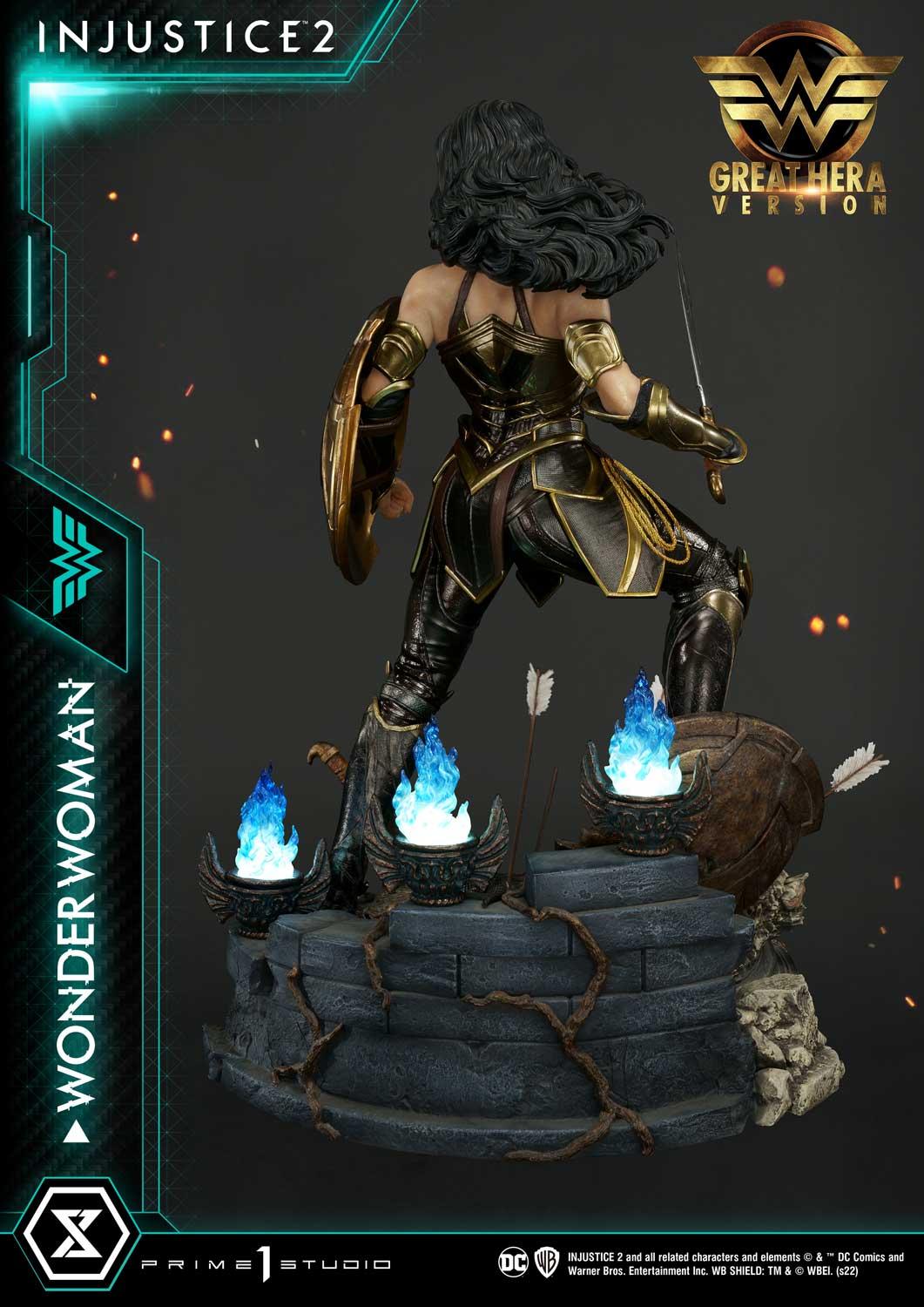 Wonder Woman Great Hera stands powerfully on an Injustice 2-inspired base...a battlefield in which she was the obvious victor! Powered with LED Illumination, the base’s blue flames look like they are burning hot as the fires of Hades!