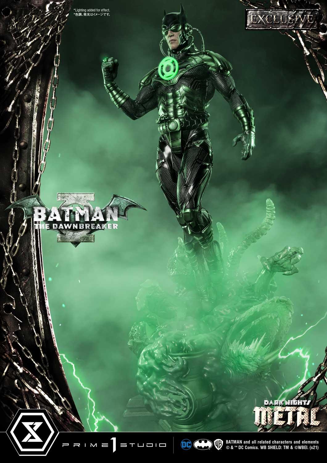 Prime 1 Studio’s The Dawnbreaker statue is poised to mete out his dark justice, floating in at 35 inches tall! The statue is a callback to Jason Fabok’s impressive Batman: The Dawnbreaker #1 cover, with its dark green energy, seething out from under Earth -32’s Bruce Wayne. The Dawnbreaker’s paint application boasts impressively vibrant, metallic green accents. The textural, and meticulously detailed sculpting of his costume only serves to enhance his terrifying visage. His base comes alive with horrifying constructs only a Dark Knight of Barbatos can conjure up. The Dawnbreaker’s dark-energy creatures are made of translucent green resin, with airbrushed highlights and shadows to accentuate the fearful forms.