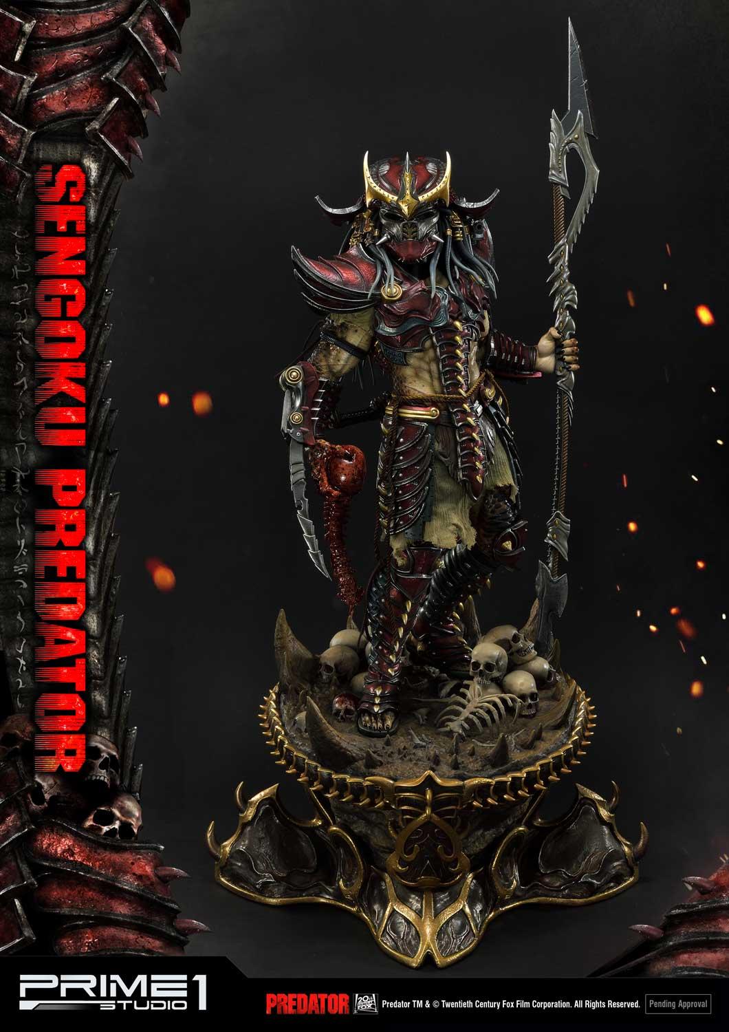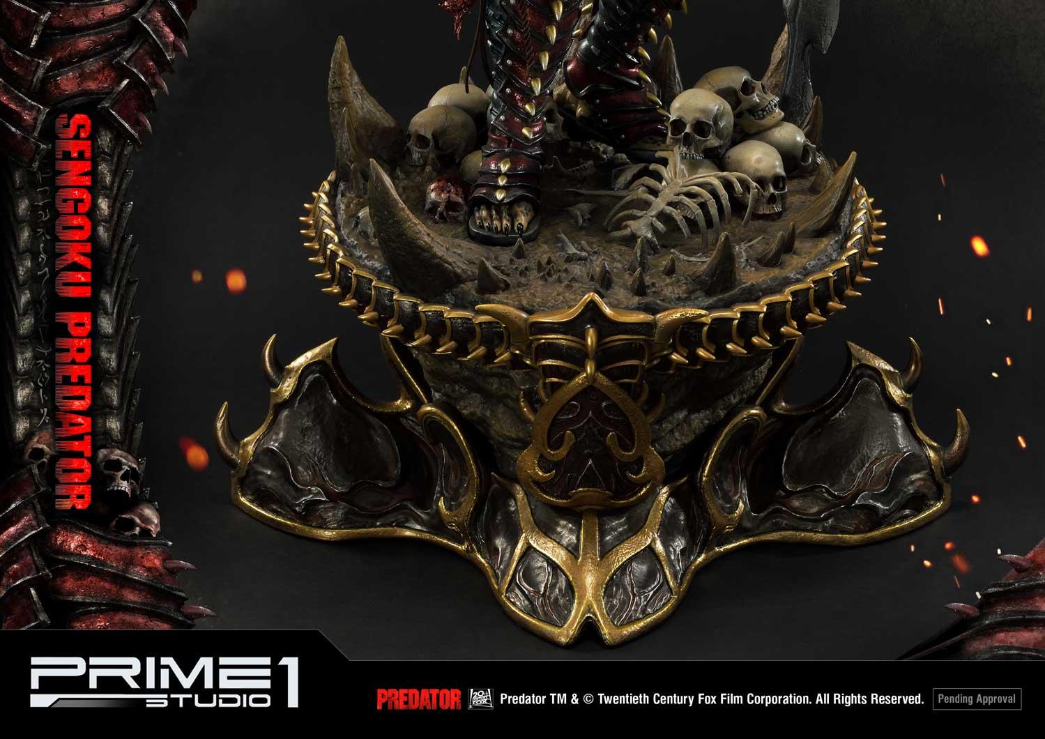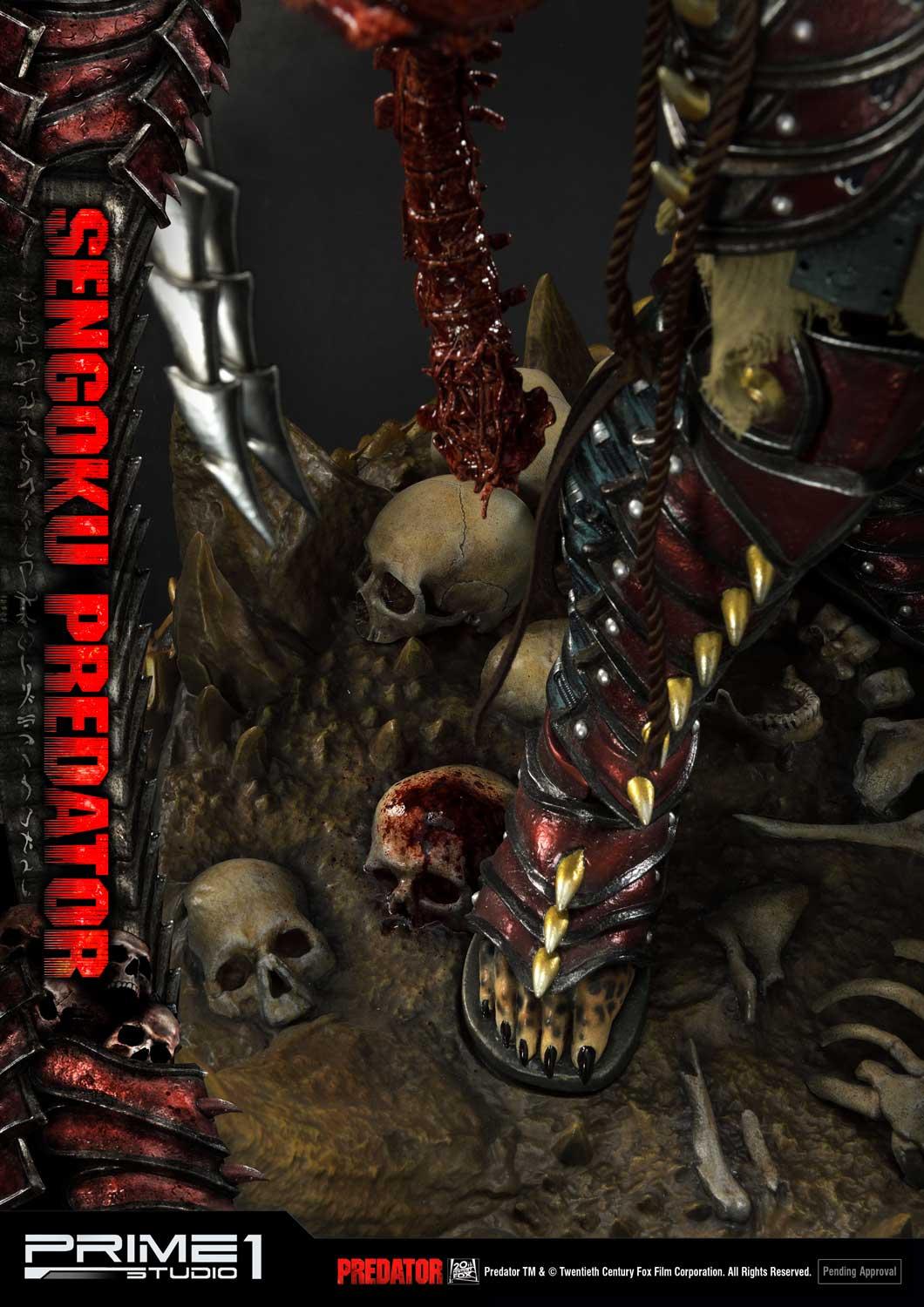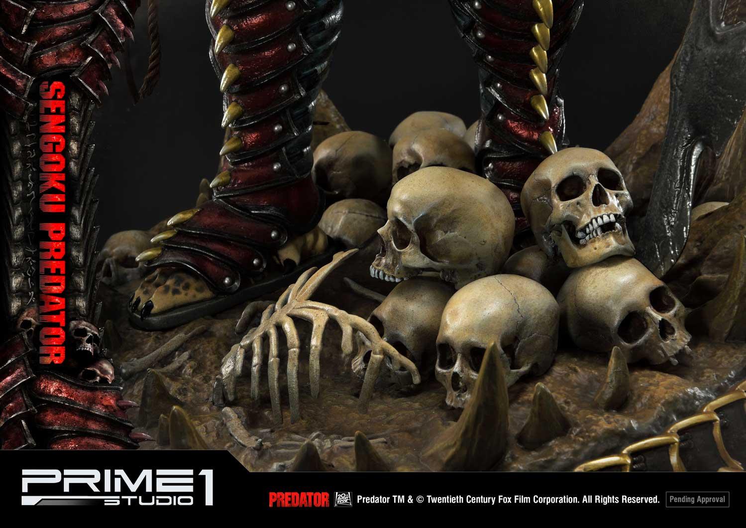 The armor design is from the Sengoku era, the main colors are red and gold which gives a nice vibe of Japanese culture. Predator’s familiar face has more brutal expression compared to other pieces. He is holding the spinal cord in his right hand, and a huge spear in the left. There are human skulls and skeletons scattered at his feet. The statue measures approximately 35 inches tall and is made with a great attention to details.