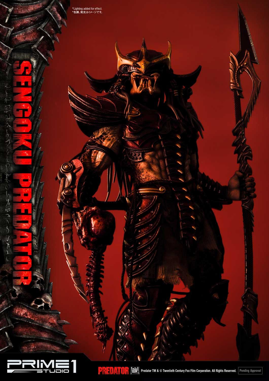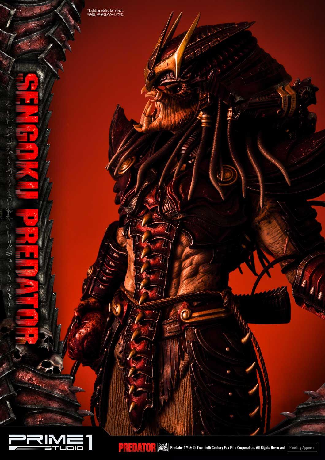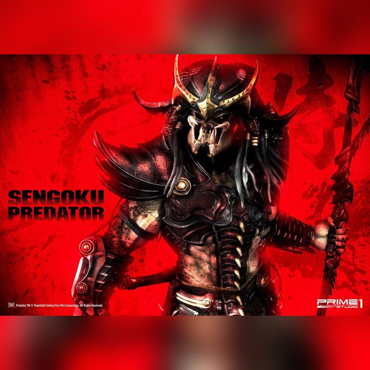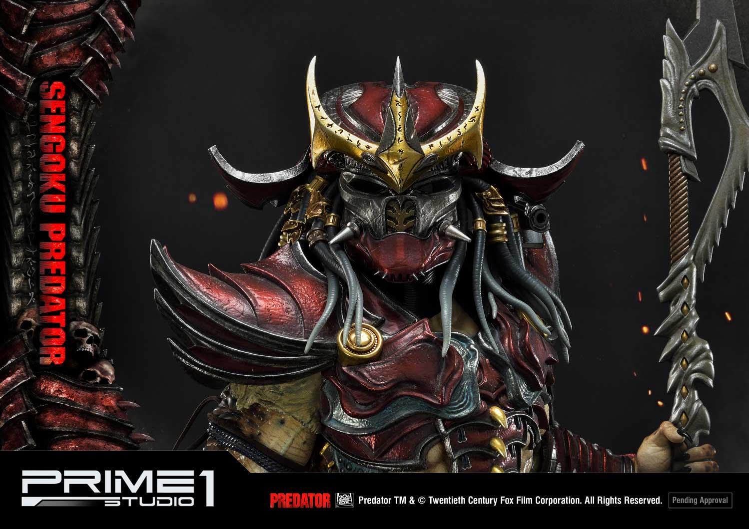The armor design is from the Sengoku era, the main colors are red and gold which gives a nice vibe of Japanese culture. Predator’s familiar face has more brutal expression compared to other pieces. He is holding the spinal cord in his right hand, and a huge spear in the left. There are human skulls and skeletons scattered at his feet. The statue measures approximately 35 inches tall and is made with a great attention to details.