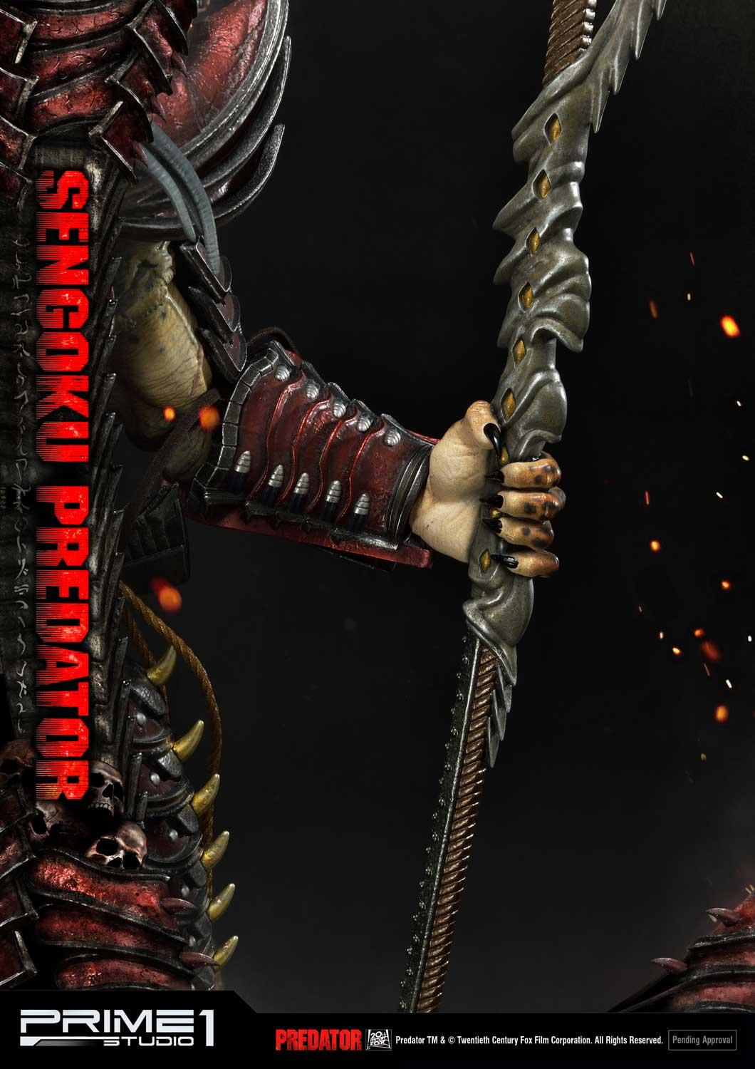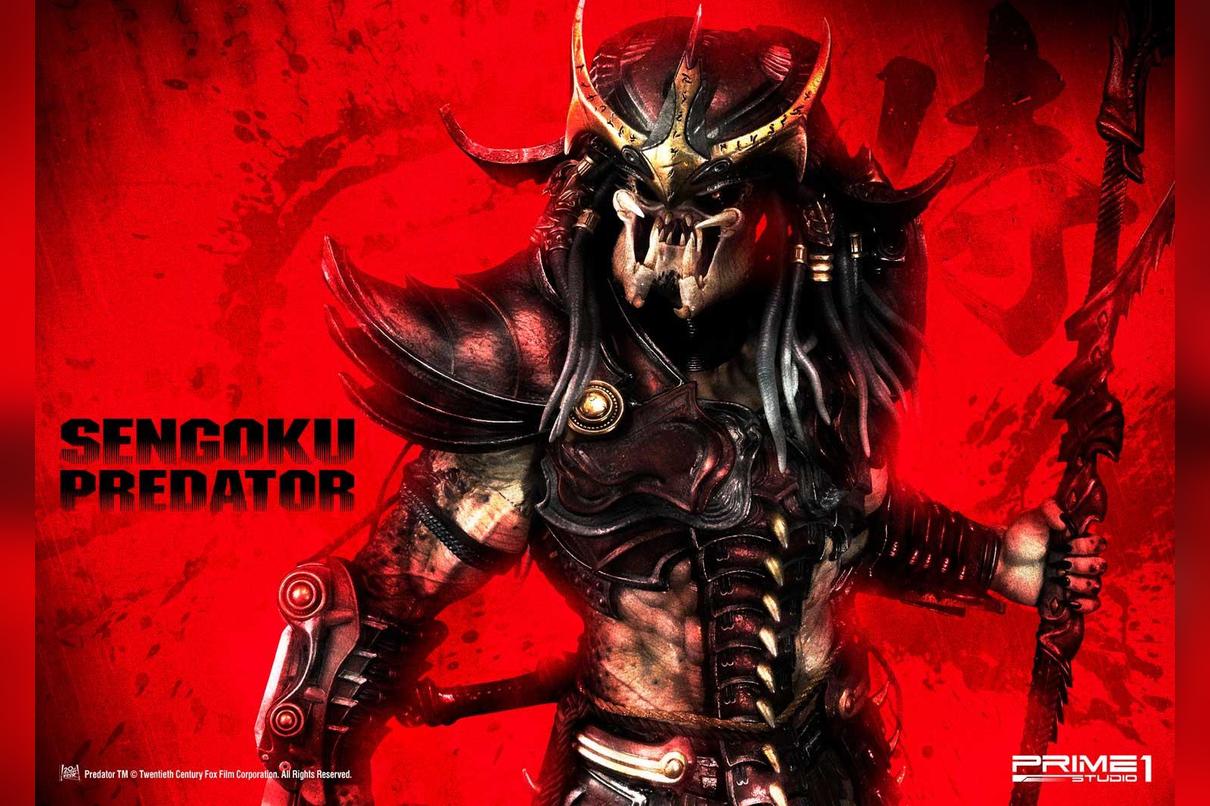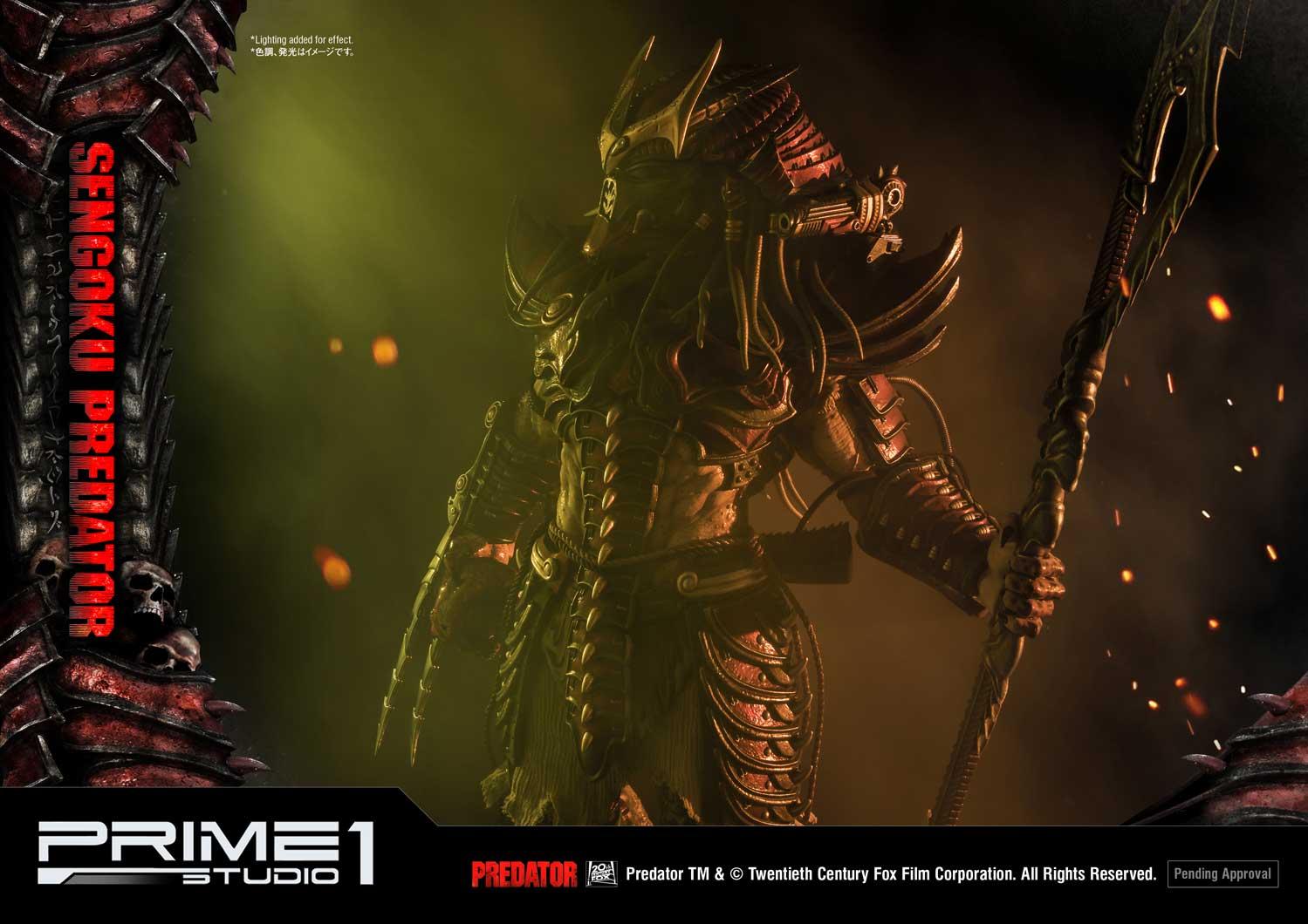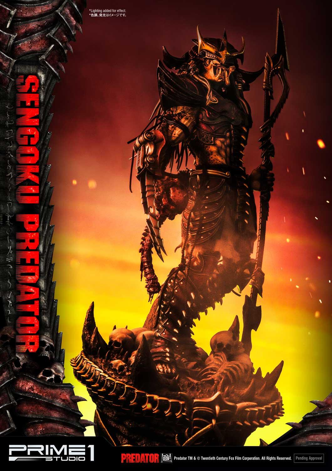 The armor design is from the Sengoku era, the main colors are red and gold which gives a nice vibe of Japanese culture. Predator’s familiar face has more brutal expression compared to other pieces. He is holding the spinal cord in his right hand, and a huge spear in the left. There are human skulls and skeletons scattered at his feet. The statue measures approximately 35 inches tall and is made with a great attention to details.