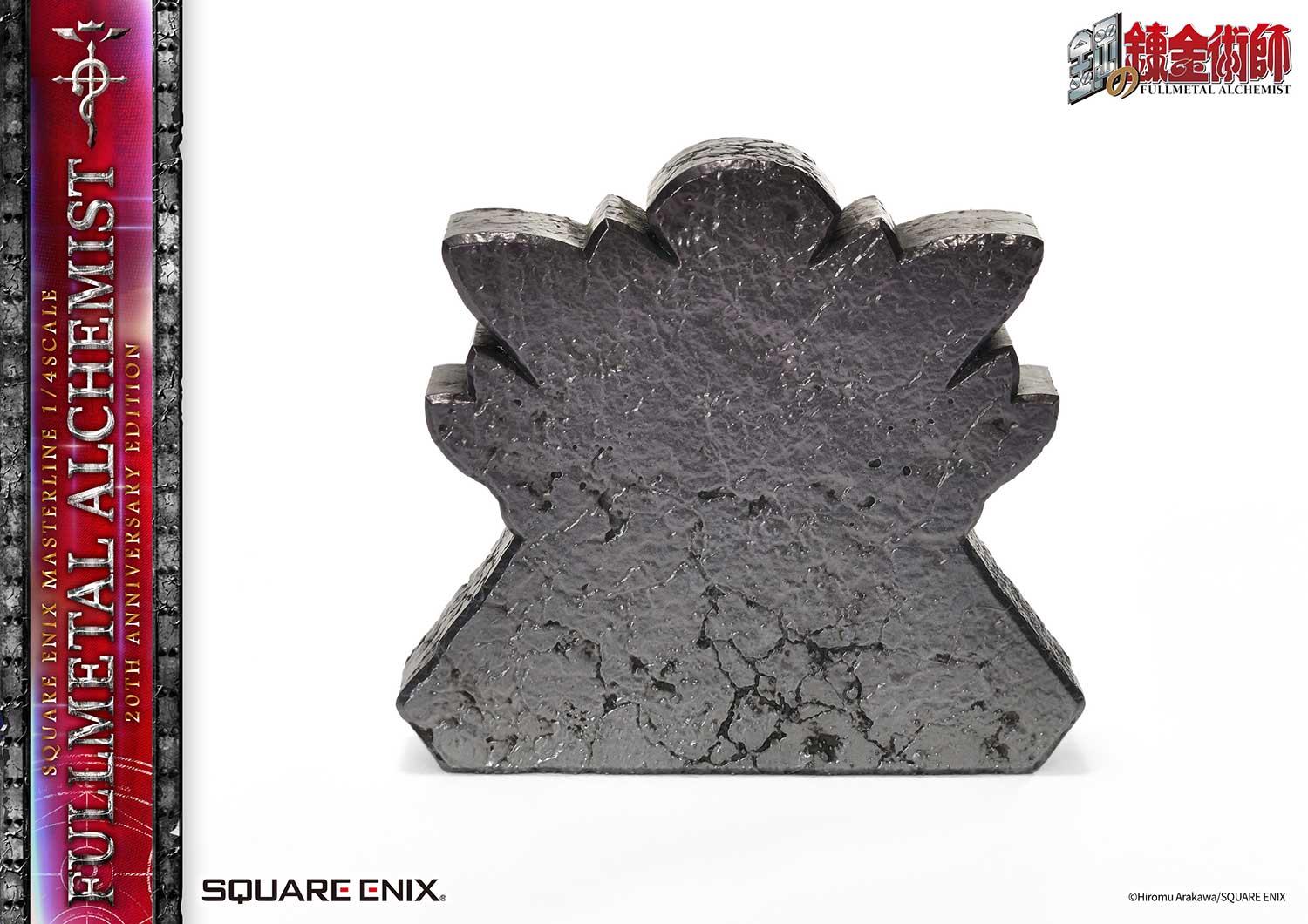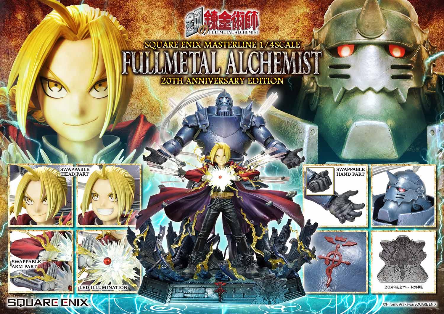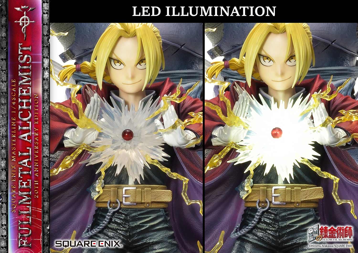 Embedded LEDs illuminate the flares of alchemy as shown in the original artwork. Additionally, a display stand with the FULLMETAL ALCHEMIST 20th Anniversary logo is also included.