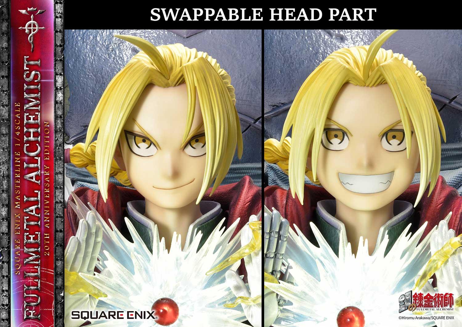Furthermore, additional swappable parts such as a full grin head portrait and automail arm for Edward, as well as open & clenched hand parts for Alphonse come with the statue to add even greater variety and customization to the original artwork.
