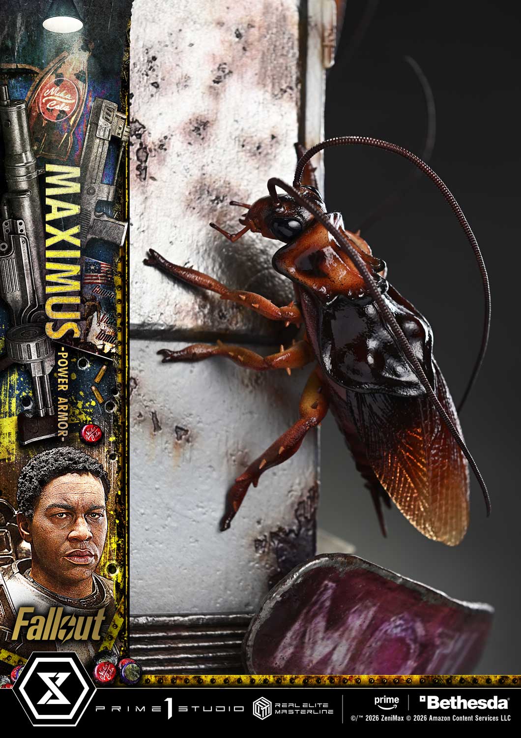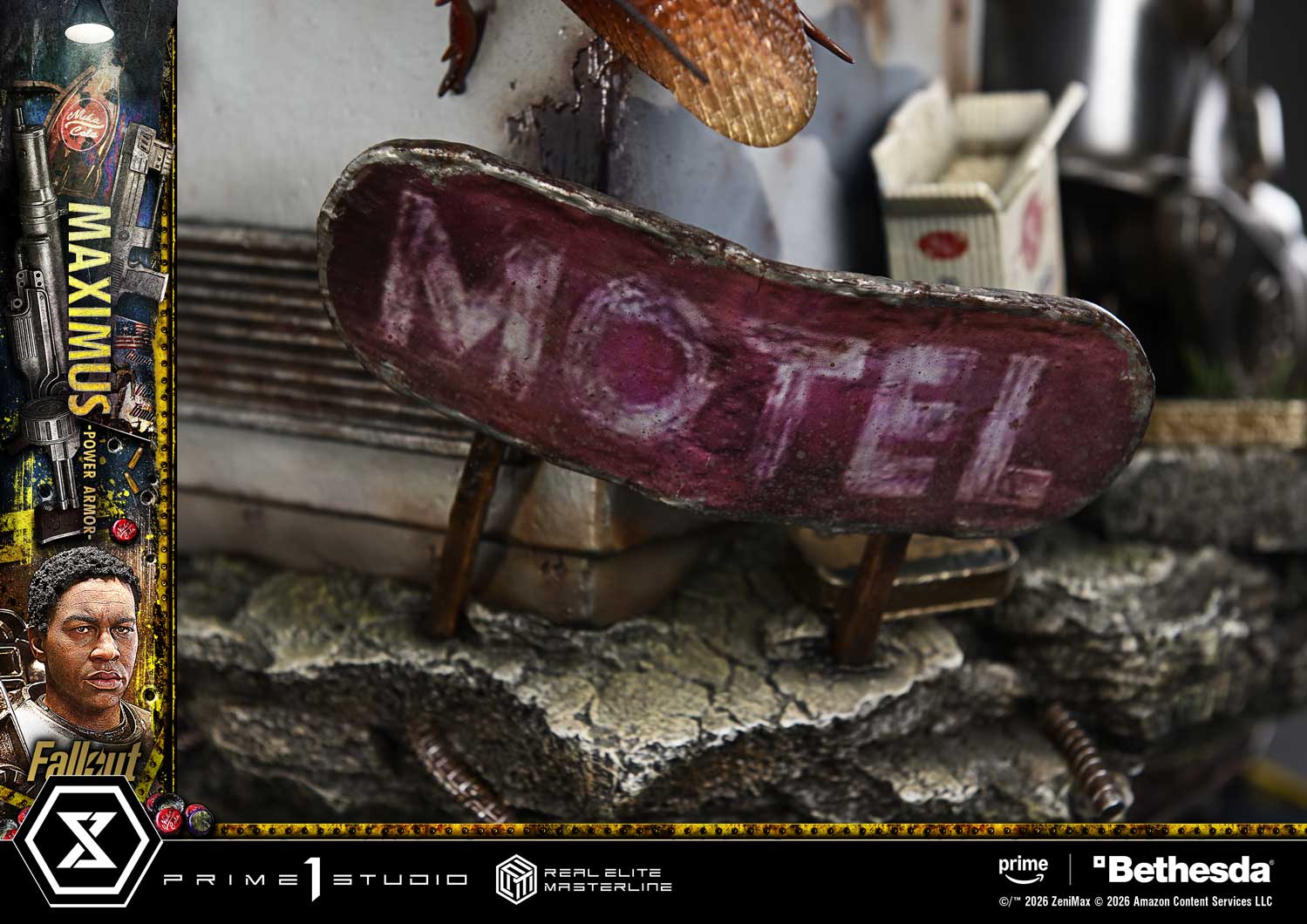 A bleached Deathclaw skull. Scuttling Radroaches. A milk vending machine that stirs memories of childhood. The specially designed base evokes the wasteland as seen through Maximus's eyes. Each element is crafted to quietly tell its part of the story.