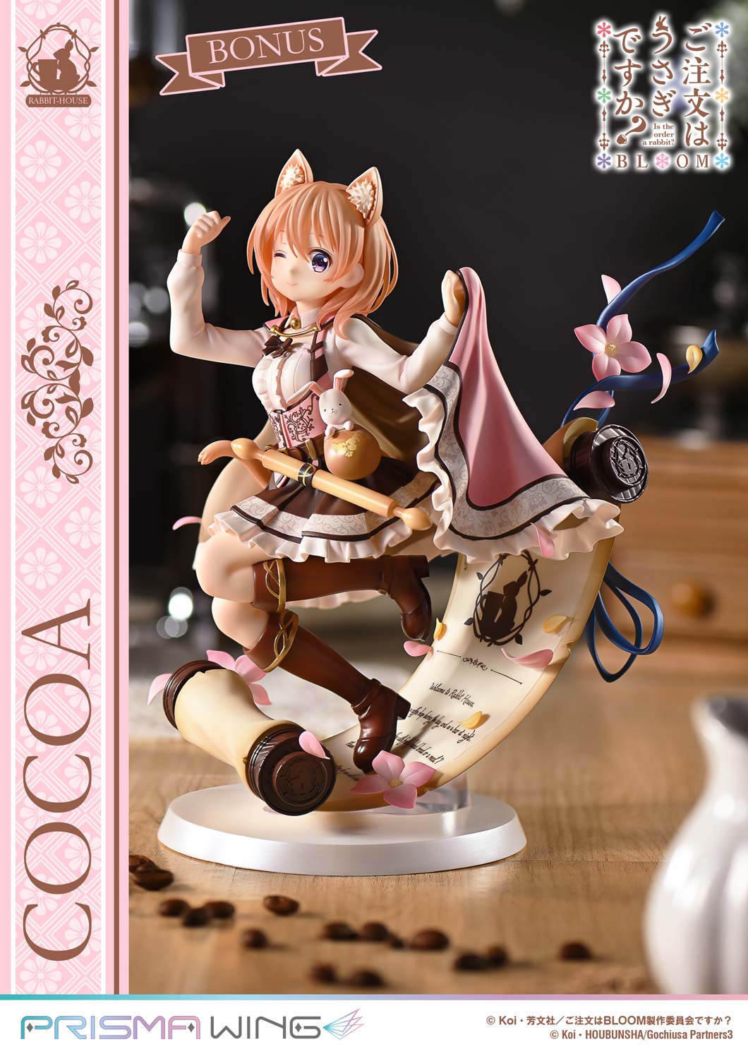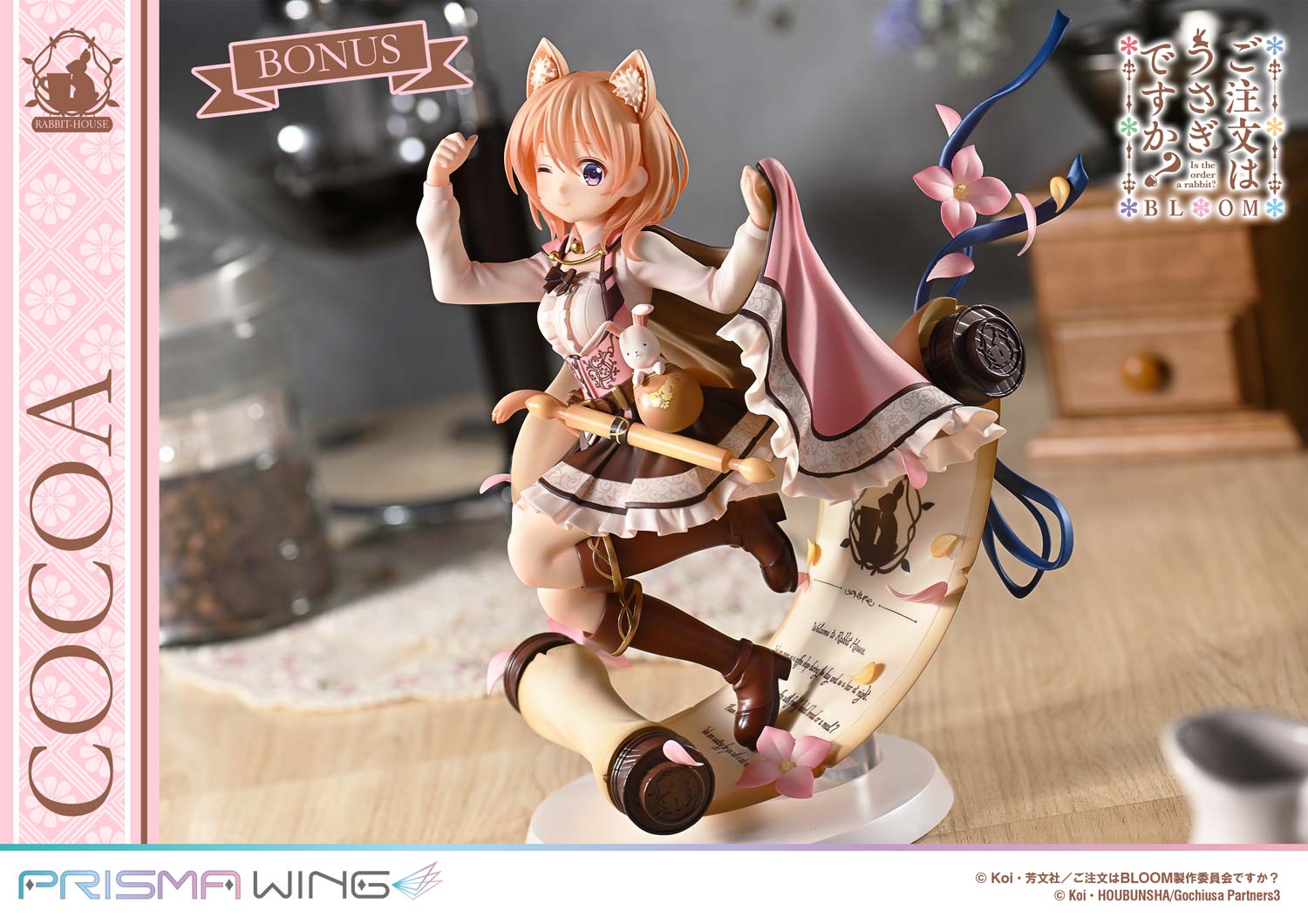 From the fluffy pink accent on her hat to the ruffled blouse and skirt and the finely embroidered corset, every detail has been crafted with great care to evoke a sense of light, dynamic motion. Accessories like the rolling pin and bunny-filled pouch are also carefully finished. The special base—originally designed by PRISMA WING—is inspired by a scroll, with a floating form that highlights Cocoa’s charm. Be sure to enjoy the message written on it as well!
