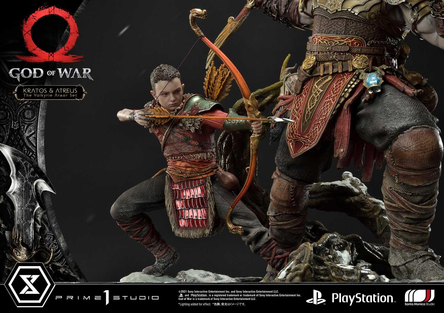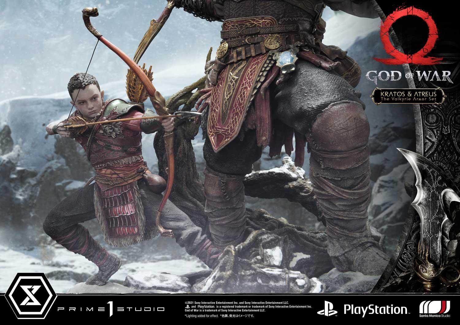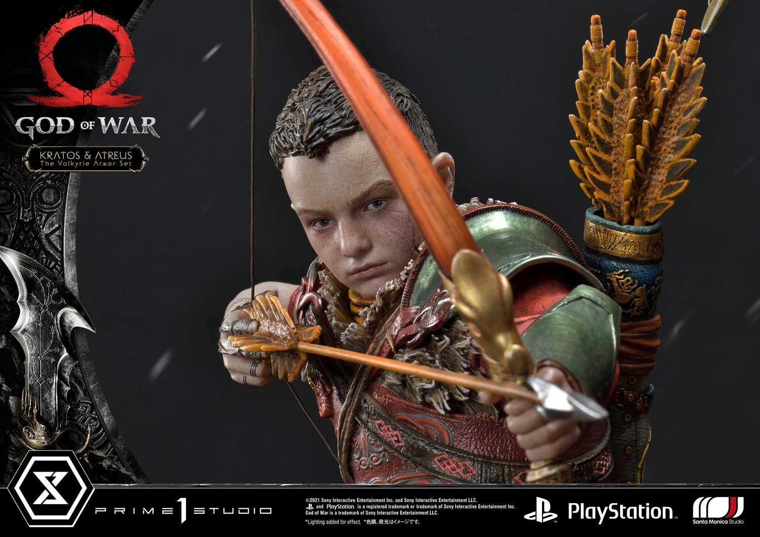 Far from being empty-handed, Kratos wields his signature game weapons: the Leviathan Axe and the Guardian Shield...both rendered in stunningly crisp detail as only our talented stable of artists can reproduce. Likewise, Atreus is shown ready to loose an arrow from his fully upgraded Talon Bow!