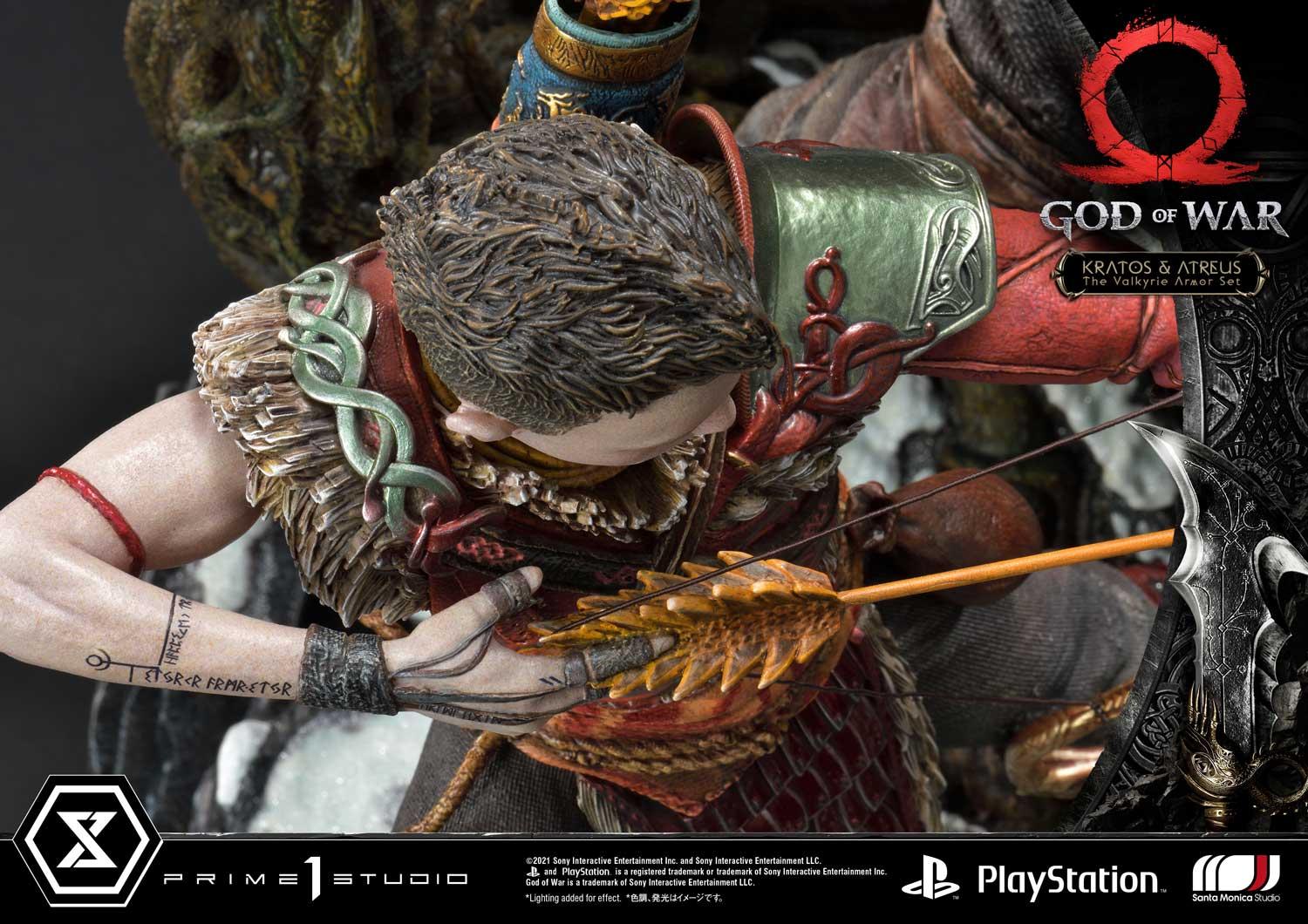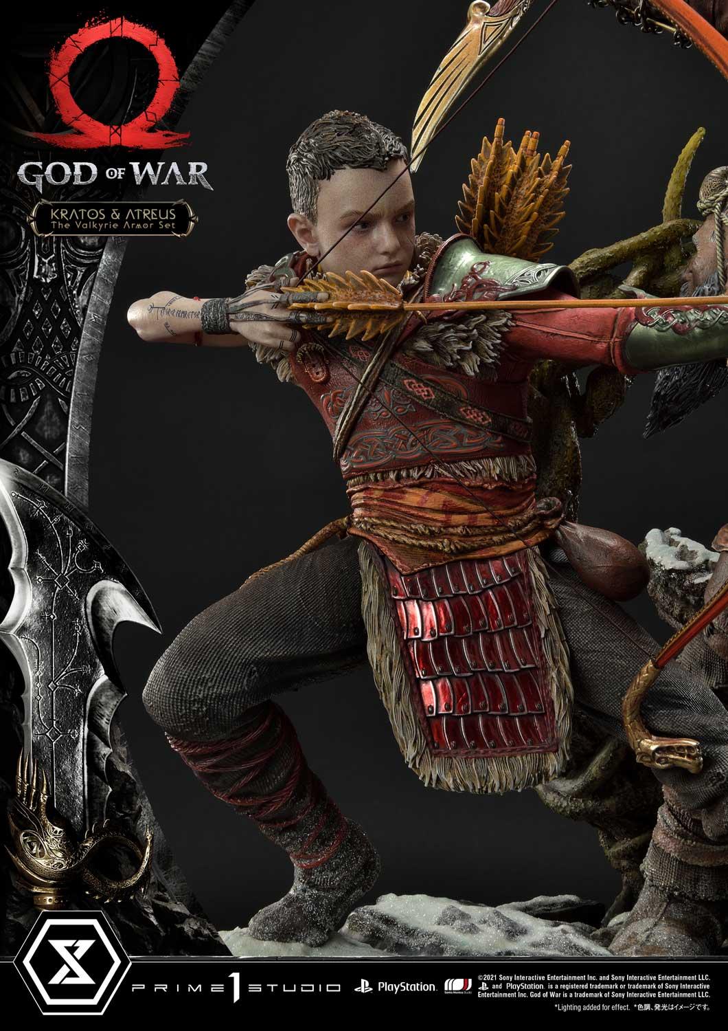 Our sculptors worked very hard to replicate the in-game design of the Valkyrie Armor Set to make it functional for a real-world figure. There are layers upon layers of plating, all with their own special embossing and scrollwork. Every strap, every buckle, every texture...True to the game, and embellished for our discerning fans. Not to be left out, Atreus has been painted in eye-popping scarlet and emerald colors, with his loincloth bedecked in metallic crimson armor plating.