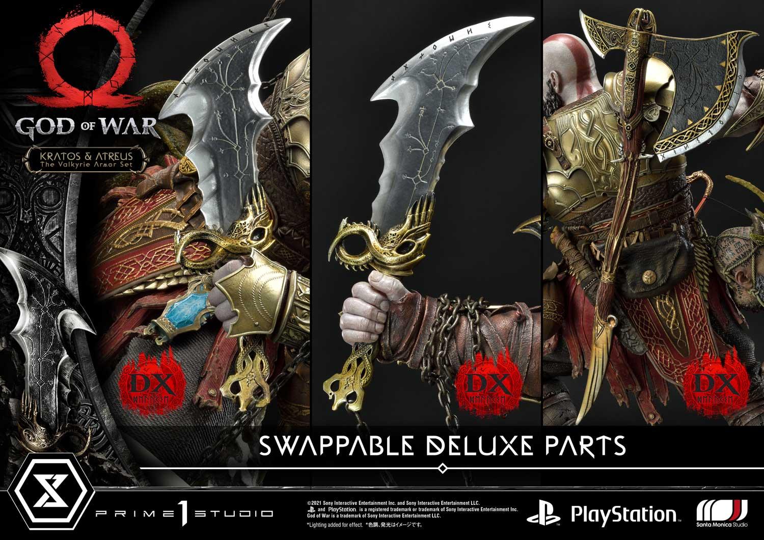 With the Deluxe Version, you get so much more! You have a choice of three (3) different portraits for Kratos, one solid angry emotion for every occasion. You also have a choice of different swappable arm sets so you can have Kratos holding his Leviathan Axe and Guardian Shield or his famous Blades of Chaos (for that descent into Helheim aesthetic!) And for an added touch of realism, his Leviathan Axe and Blades of Chaos are available as items you can attach to his back when they are not in use.