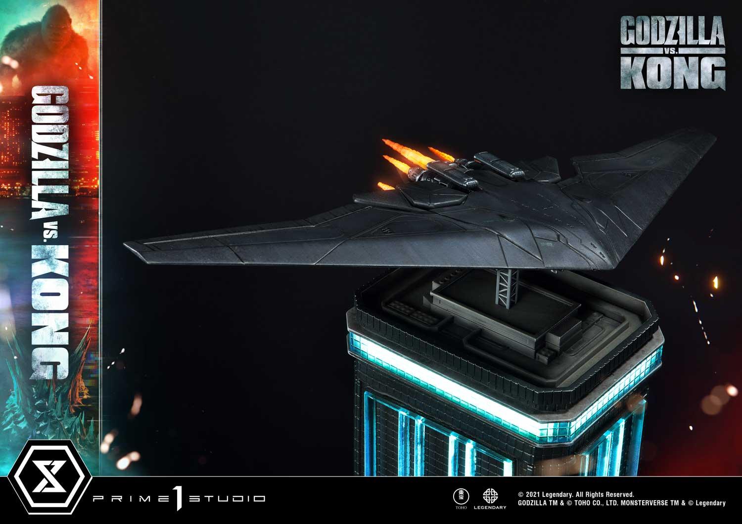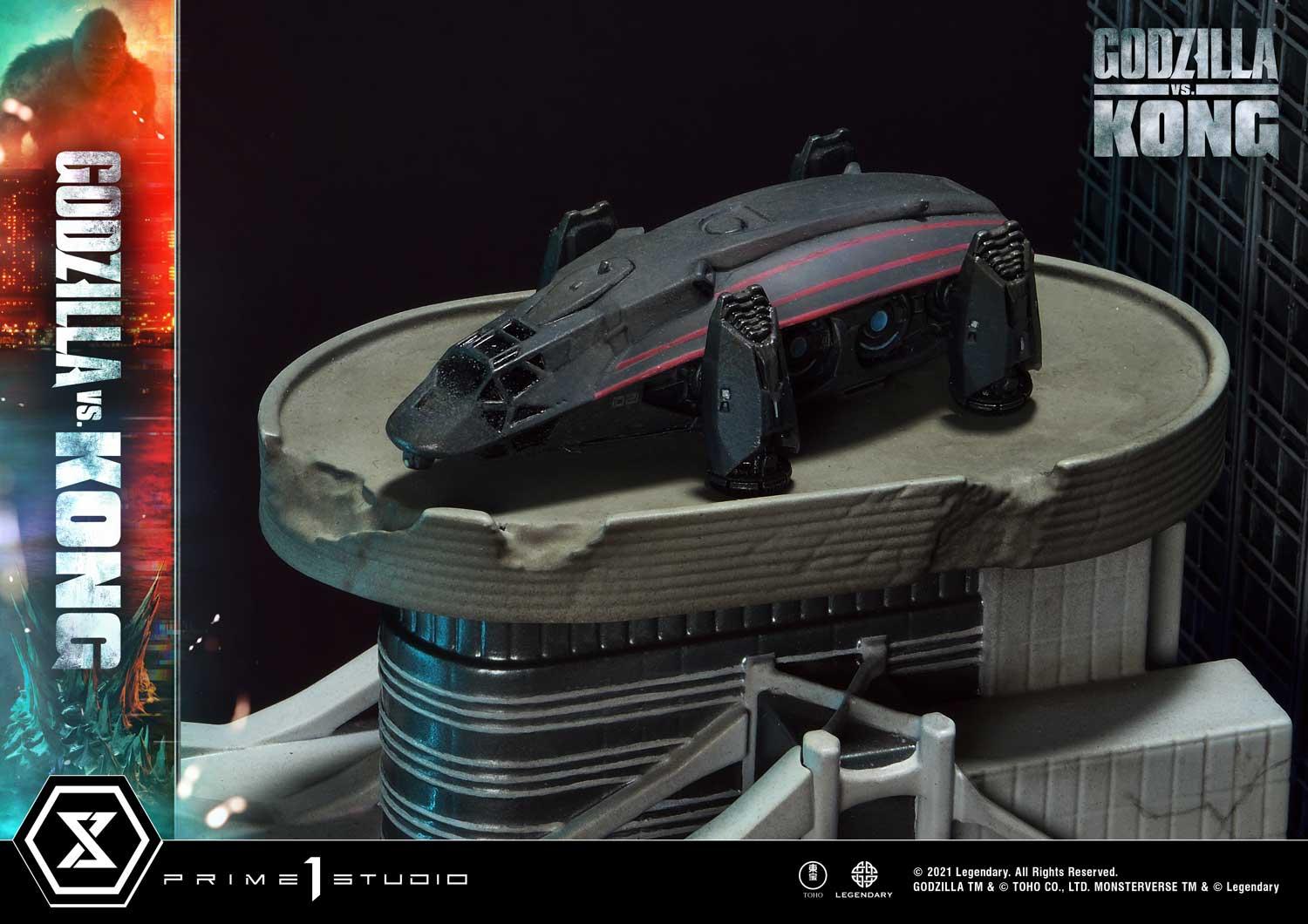To complete this titanic environment, this diorama set comes with a “bridging cityscape” piece which consists of a high tower, a central tower, and a title plaque! The bridging cityscape’s high, left tower can be fitted with a giant flying aircraft carrier, the USS Argo. While the central tower features one of Walter Simmons’ extremely expensive and powerful H.E.A.V.s (Hollow Earth Aerial Vehicle) which could later feature prominently in reviving a downed giant! The bridging cityscape can be sandwiched between both the Godzilla diorama and the Kong diorama and features its own LED-Illuminated buildings and fire and smoke effects. And finally, to finish of this lavish display, place the Godzilla vs Kong title plaque prominently in the center and marvel at the magnificence that is this diorama!