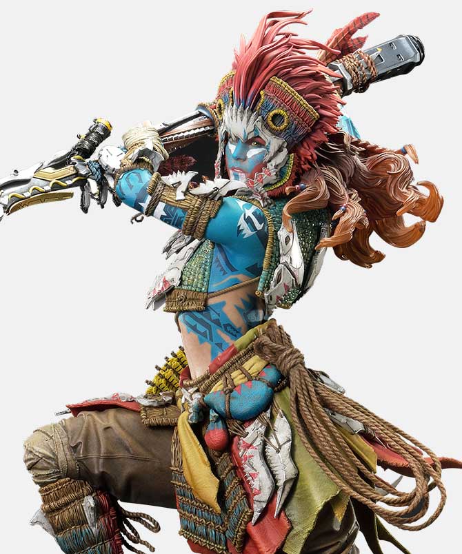 Aloy’s flushed cheeks and focused gaze. The worn textures carefully painted onto her Death-Seeker's Shadow and Tenakth Vanquisher. Her small frame carries an impressive wealth of detail and determination. From the tension in her fingers as she nocks an arrow to the dynamic sweep of her braided hair, every nuance contributes to the story.
