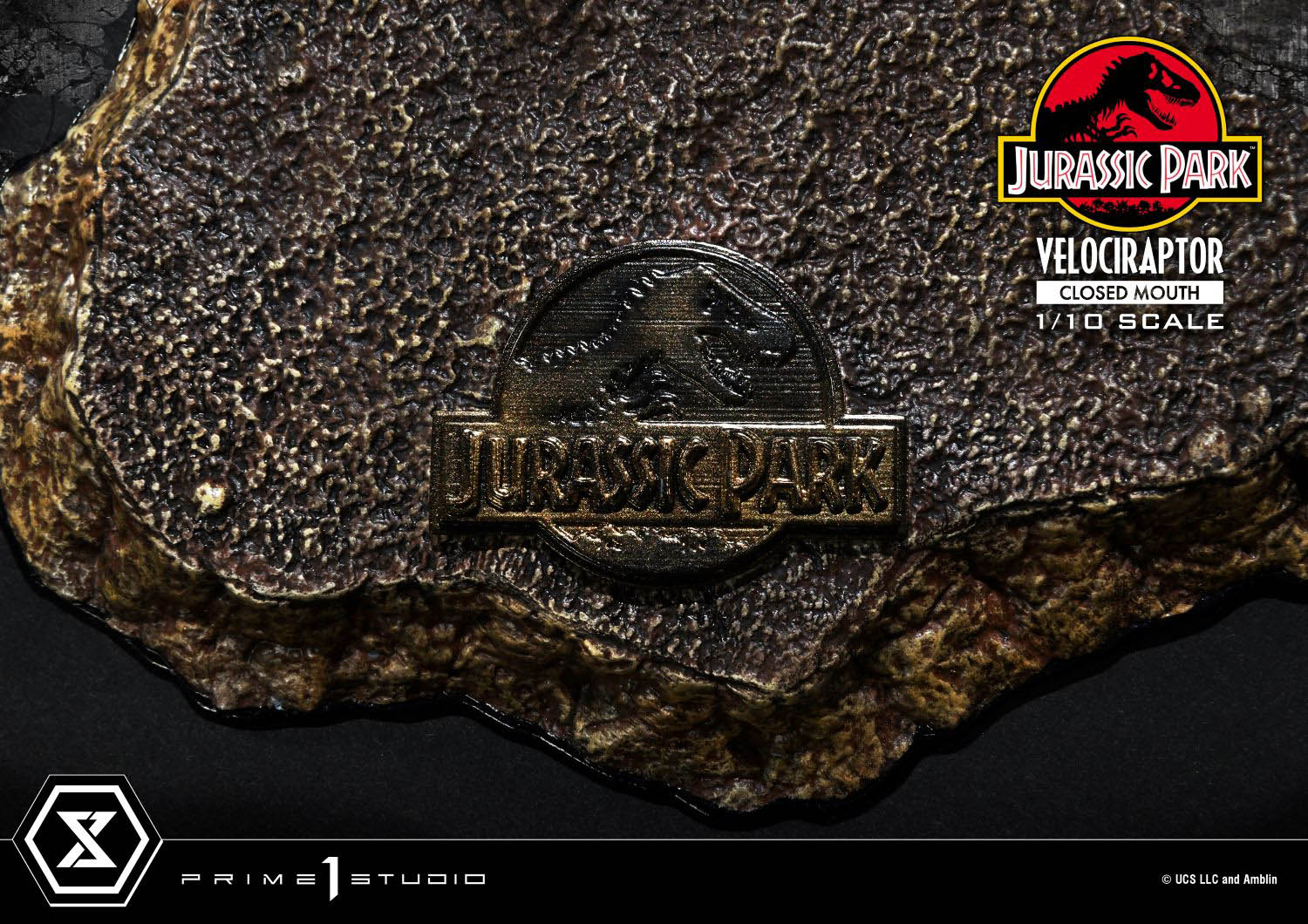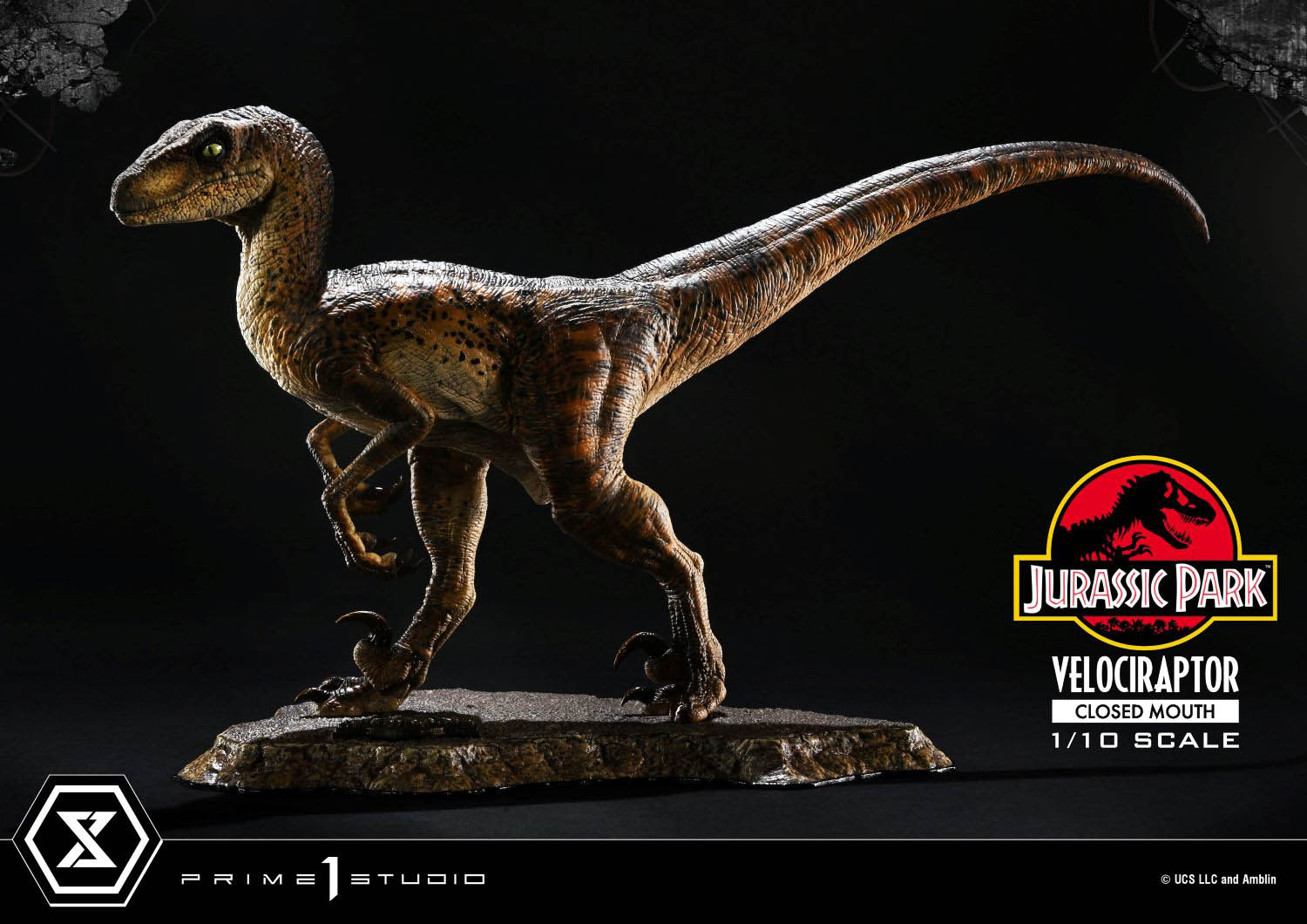 Featuring a lifelike reddish-brown body with black stripes and spots, this figure has razor-sharp claws, and piercing yellow eyes, perfectly capturing the raptor's fearsome appearance. The long, powerful tail, combined with intricate sculpting and painting, brings this intelligent and agile predator to life. The unique base, inspired by Isla Nublar, the iconic setting of Jurassic Park, is complete with a distinctive logo plate that fans will instantly recognize.