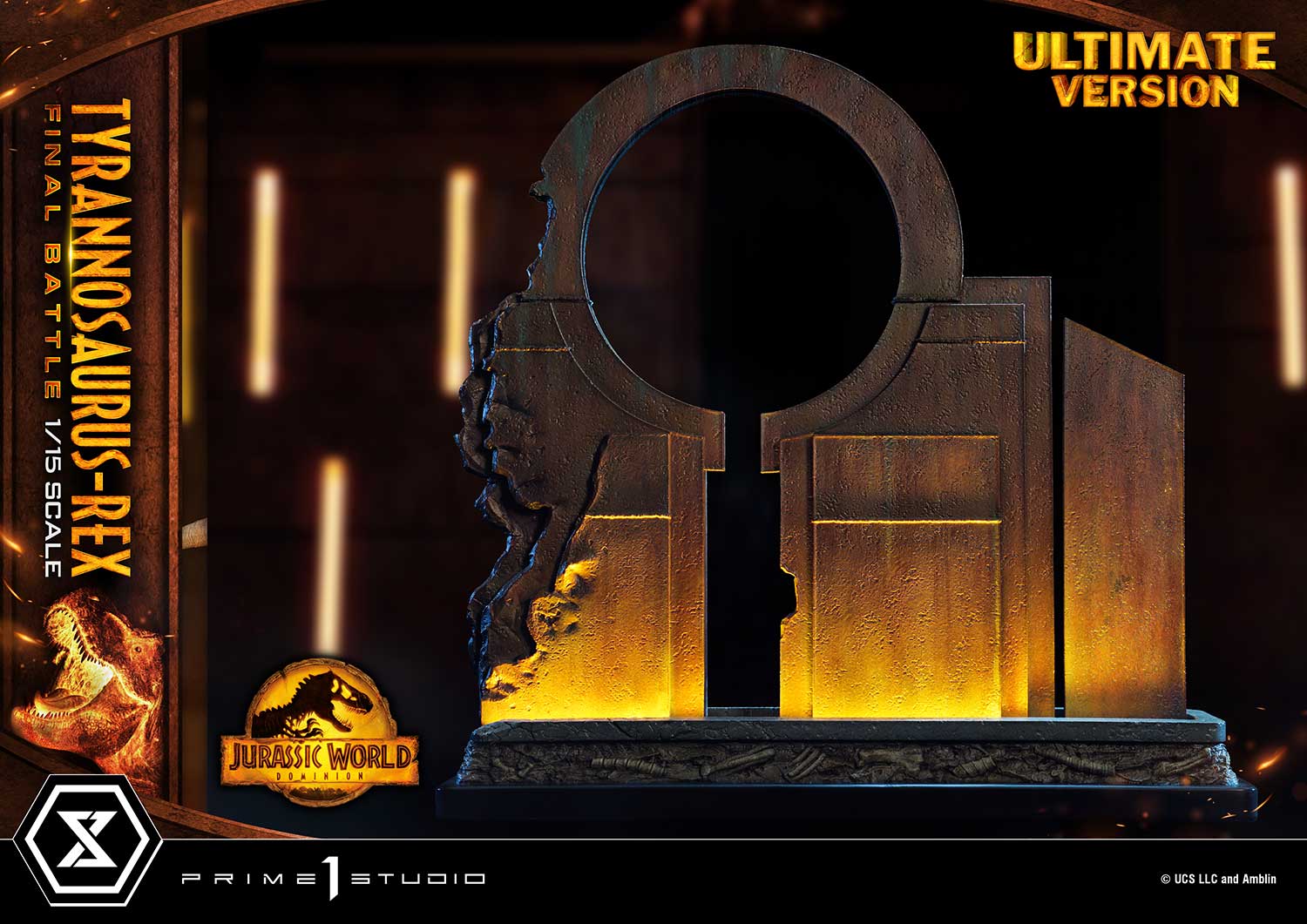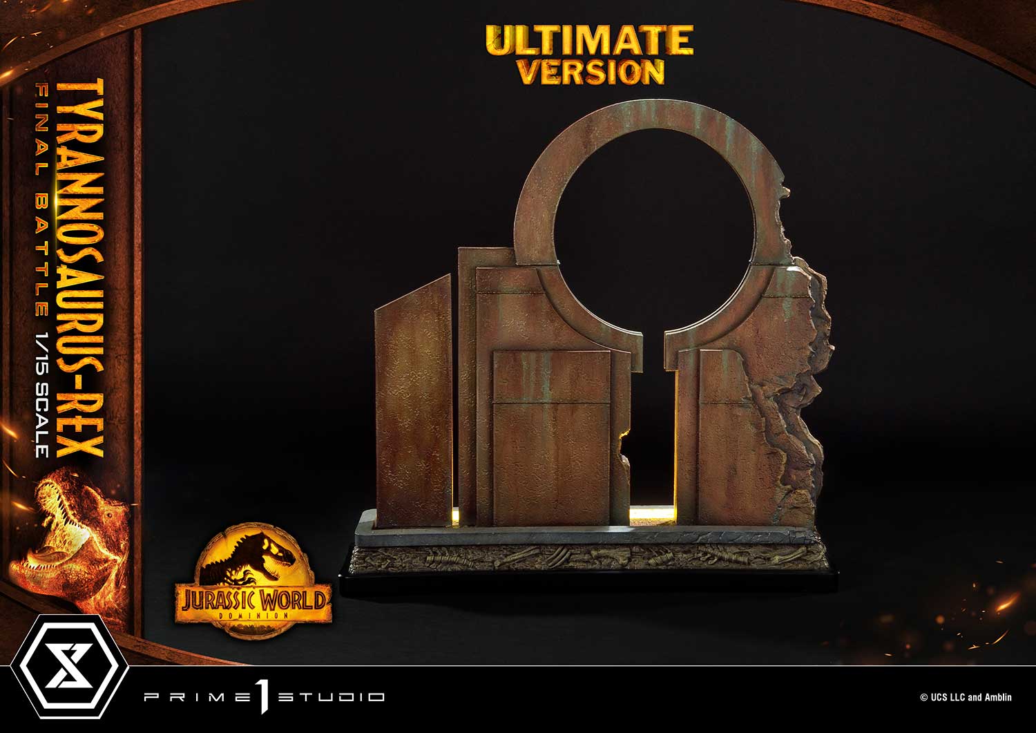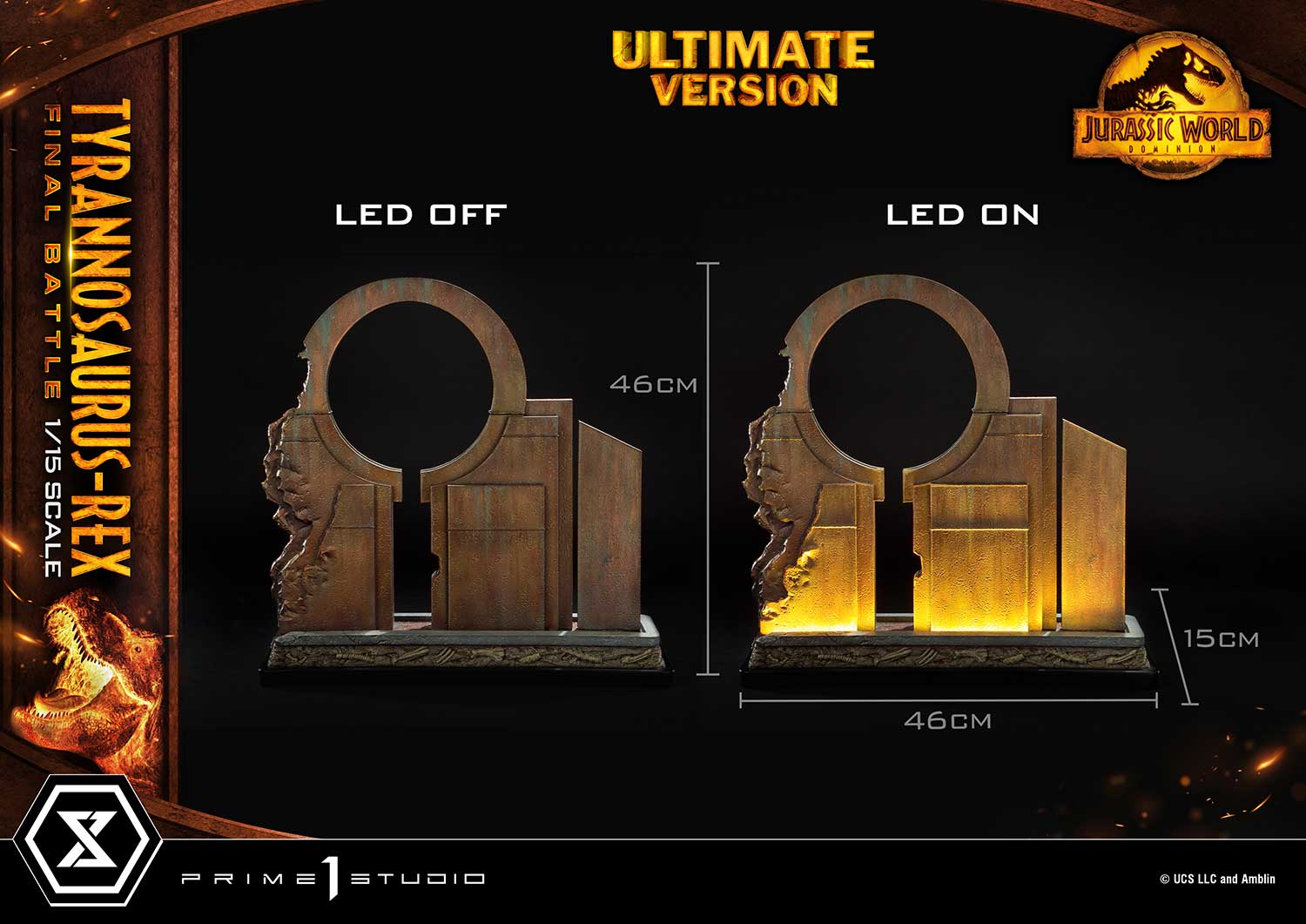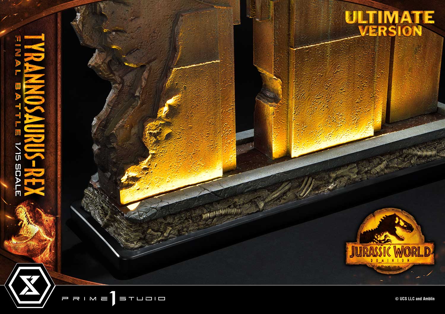 When you order the Ultimate Version from our official online store or any authorized distributor, limited to only 350pcs, your statue comes with an 18-inches tall decorative wall base that has LED light-up functionality. The damaged sanctuary wall is sure to create a more moody and intense ambiance to your piece of Jurassic art.