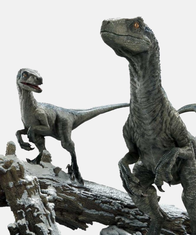 Our exceptional team of artists has come together once again to craft a truly magnificent recreation of Rexy as she rushes toward her enemy in this two-on-one thrilling conclusion that took place at the Biosyn Sanctuary. With a powerful jaw, overwhelmingly muscular legs, and a long, thick tail that extends proudly; The T-Rex is no ordinary foe. A closer look at her skin reveals scars on her back and shoulders that have accumulated over her 29-year history, the very same scars, as a matter of fact, that were left by the velociraptors in the first movie that started it all! All of these are reflected in the elaborately textured surfaces and rich brown coloring with the natural shading effect that shows true craftsmanship. The base features a fossil layering beneath the earth and the crumbles of the sanctuary.