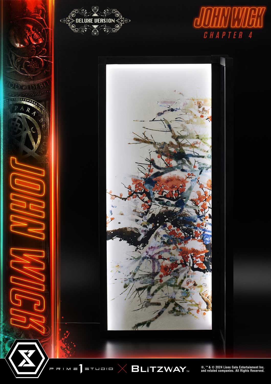 The Deluxe Version adds a separate Art Wall, also LED illuminated, carefully recreated traditional Japanese paintings, as featured in the Osaka Continental’s exhibition hall, where the encounter between the two assassins went down.