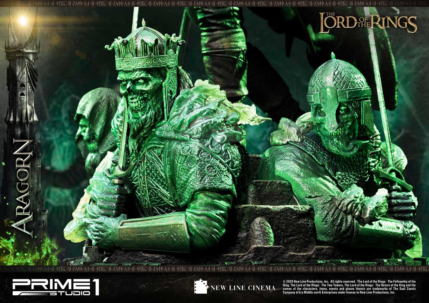 Aragorn and the King of the Dead lead the assault! From top to bottom we have put the upmost attention to detail in this masterpiece. The glorious Evenstar jewel hangs around the neck of the most film accurate Viggo Mortensen likeness on the market. This Deluxe version will feature two (2) extra portraits to display a variety of expressions. Aragorn’s sword: Andúril has been perfectly crafted and even features the ancient inscription. We have added a translucent resin effect on the Army of The Dead to create the ghostly feel of the army. We have brought all these elements together to bring one of the most breathtaking scenes in the entire The Lord of The Rings Trilogy to your collection! More than a must-have for fans and collectors everywhere!