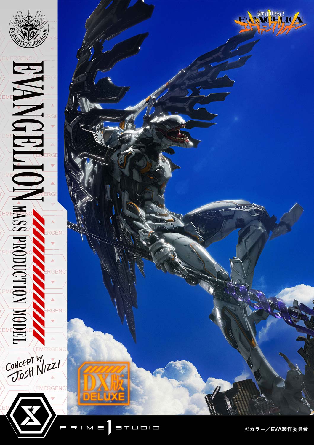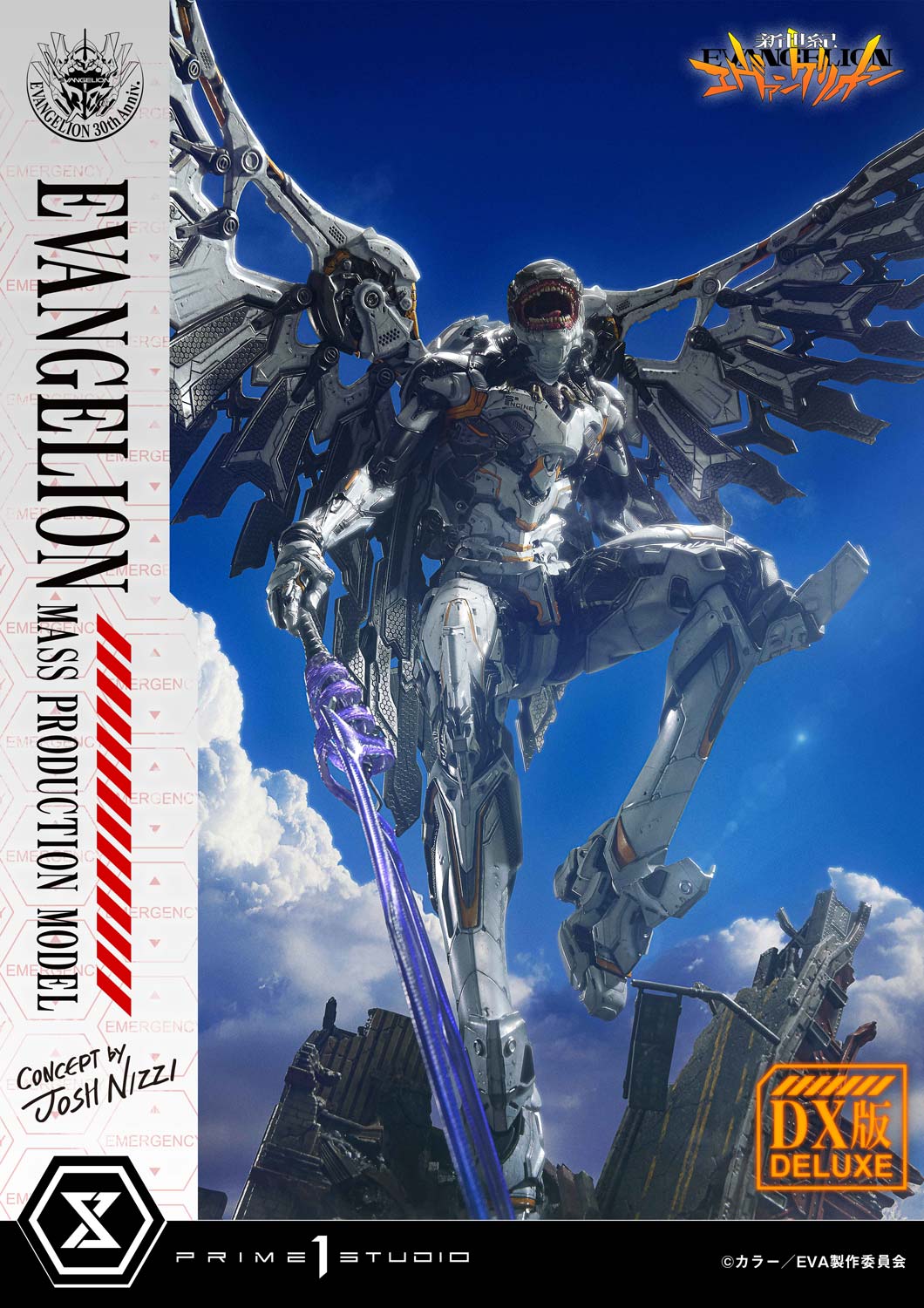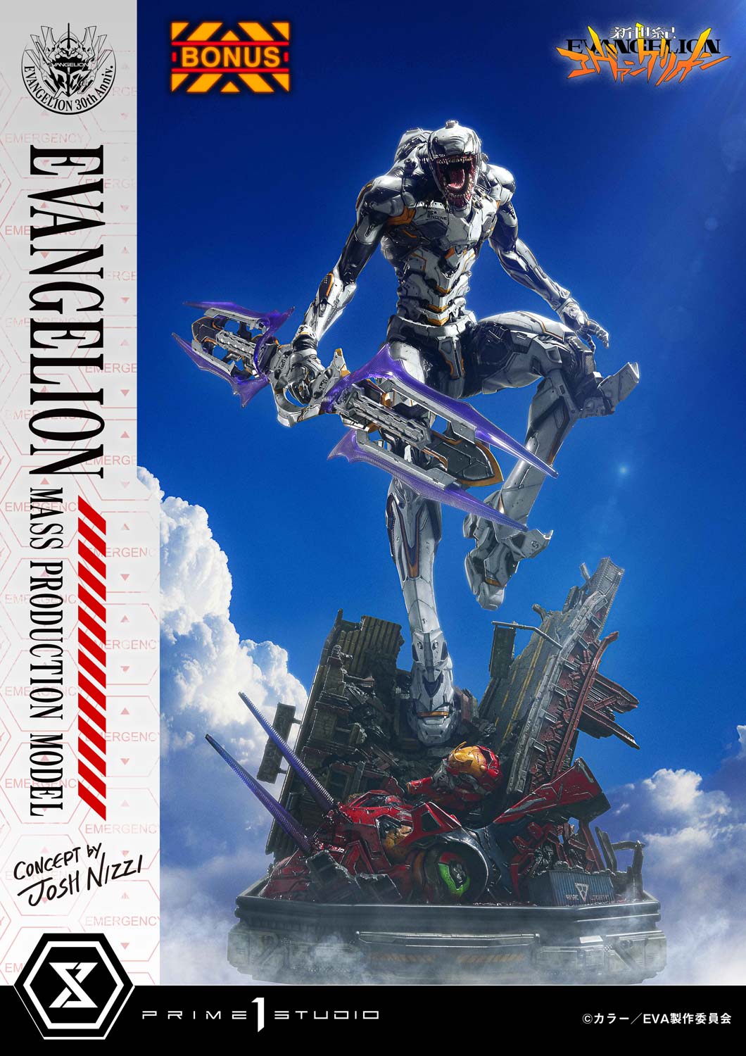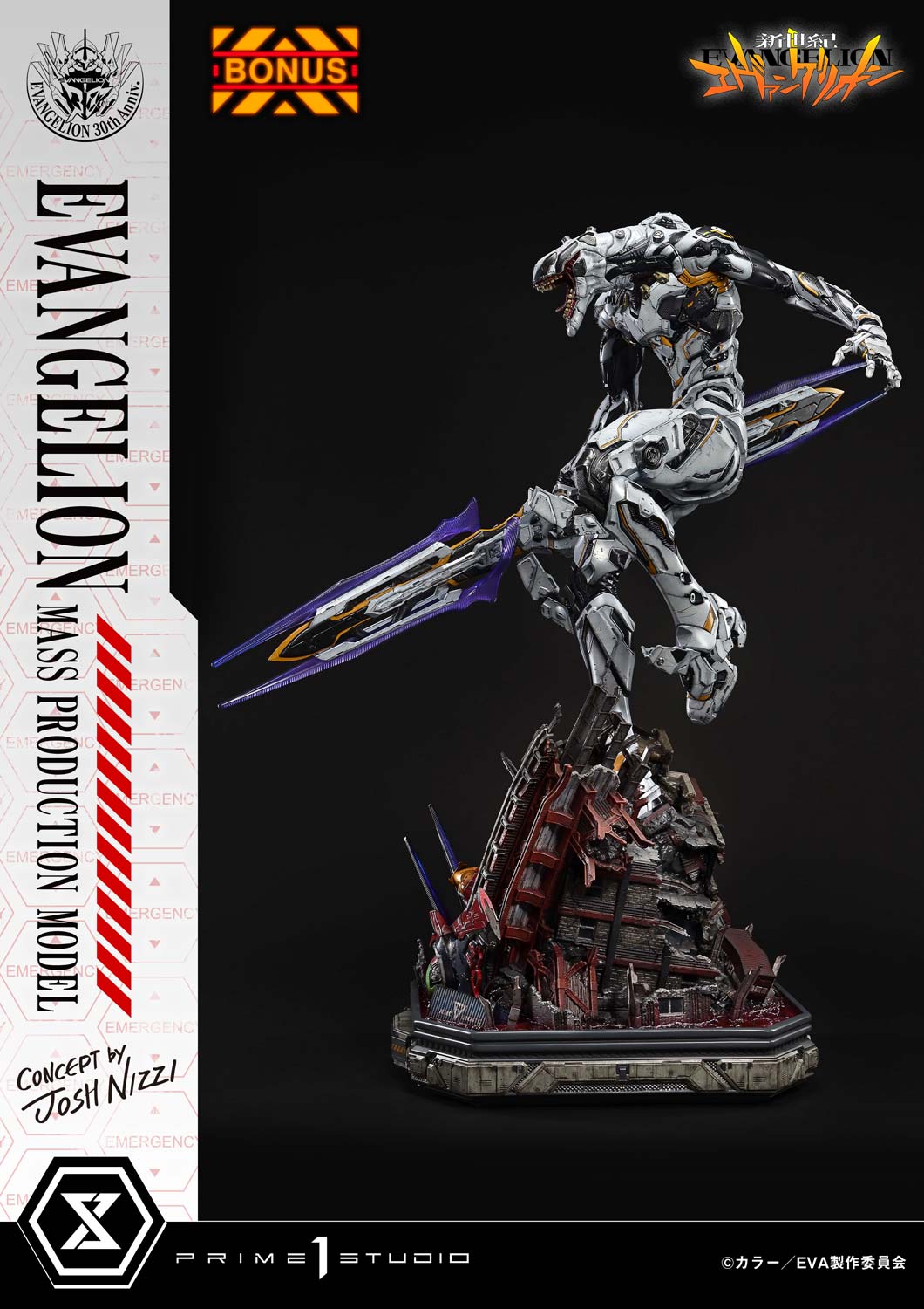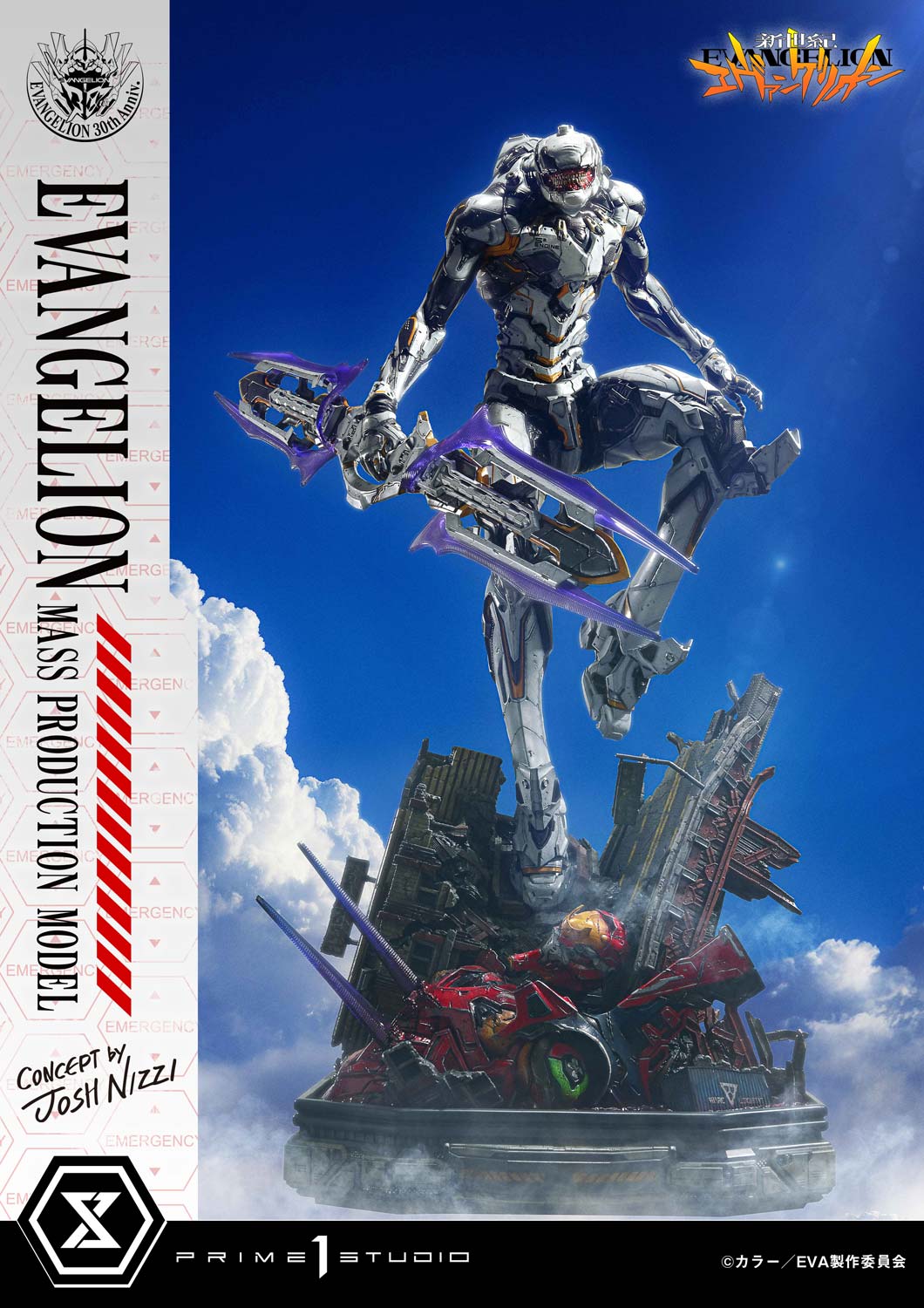 Featured in "Neon Genesis Evangelion: The End of Evangelion", this aberrant series of Eva units left countless viewers scarred. This statue accentuates their soulless, uncanny presence through concept design by Josh Nizzi. While honoring the original organic form, it incorporates intricate details such as panel lines and internal mechanisms. The white-based color scheme is complemented by metallic, muted silver and accented with a warning yellow. The purple-hued sword is imbued with a sharp tension within its delicate sculpt.