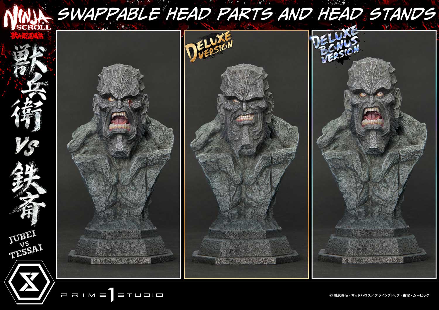 The DX Bonus Version includes additional head parts and head stands. Jubei reveals his wounded face beneath his woven hat, while Tessai wears a sneering expression as he looks down at his opponent. These interchangeable parts allow for various display options to suit your preferences.