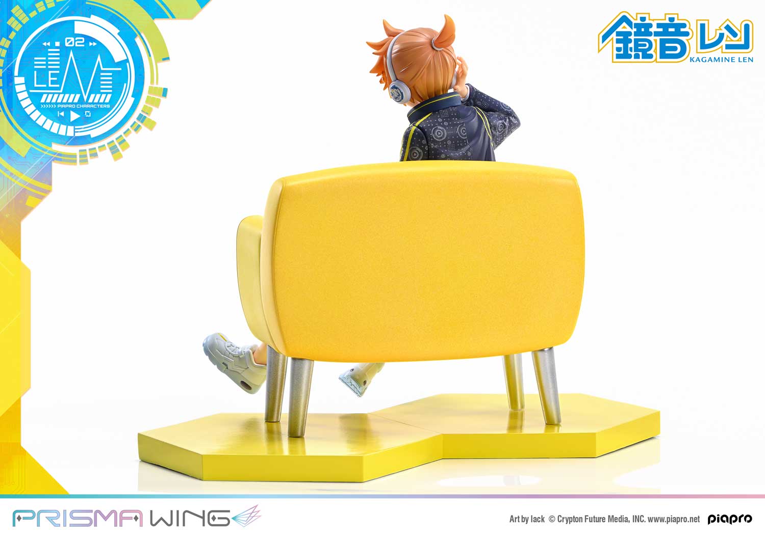 Lounging on a yellow sofa, fully immersed in his love for music—Len’s relaxed pose is faithfully captured from a cyberpunk-inspired illustration by the renowned artist.