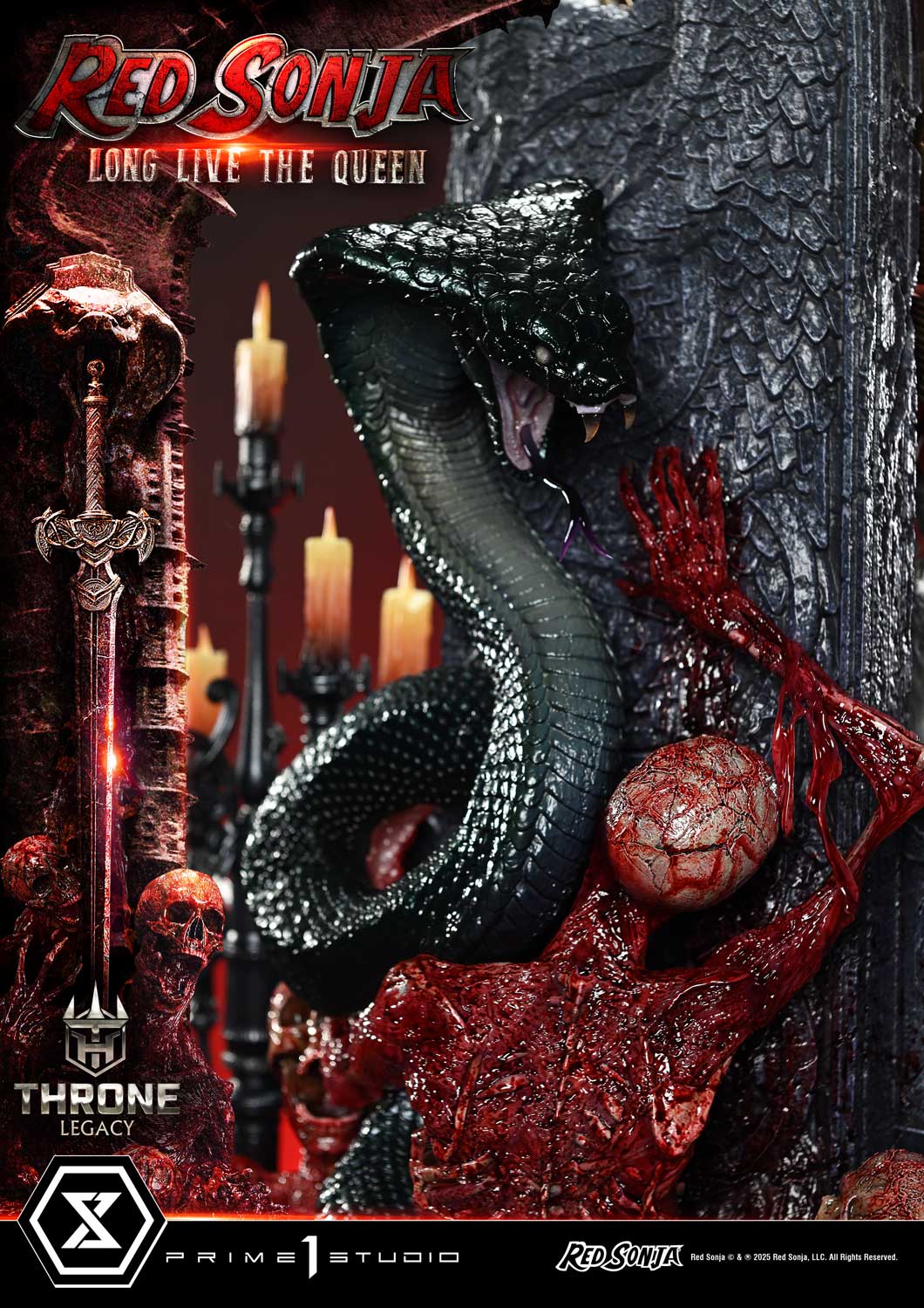 The ominous throne is faithfully based on the colors and shapes of the original artwork. At her feet, the dark spawn writhe lifelessly; gothic candelabras burn with wax candles; and a massive serpent rears its head behind her. All elements serve to exalt the rise of a new sovereign.
