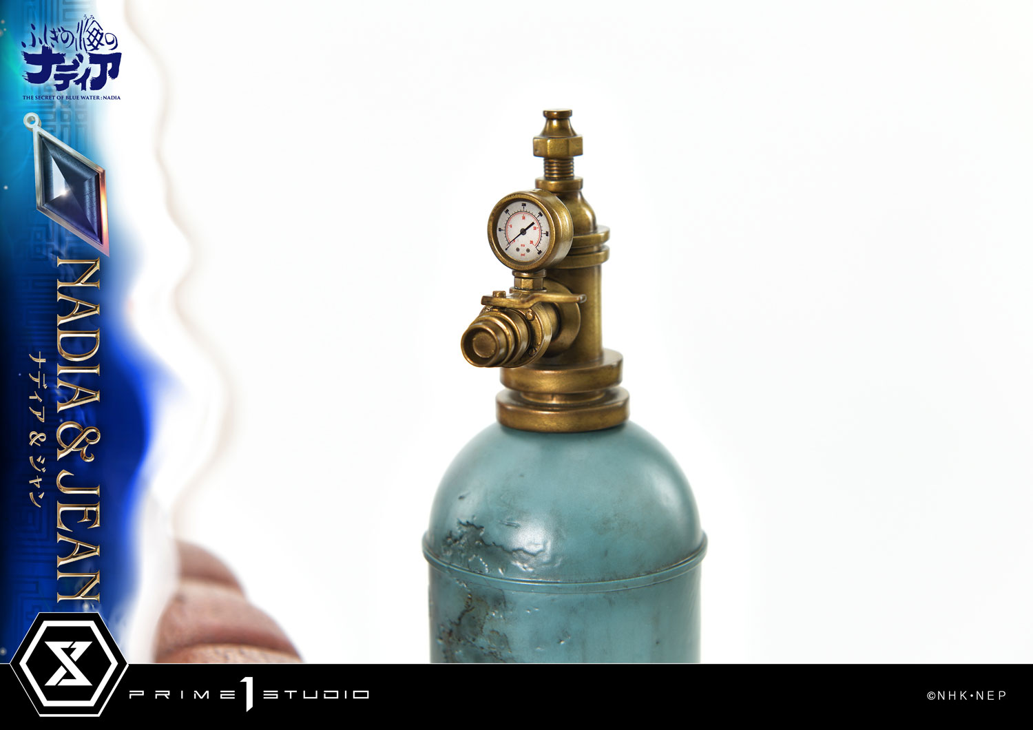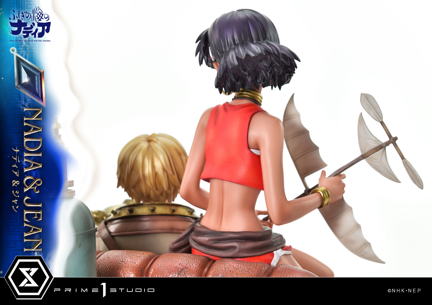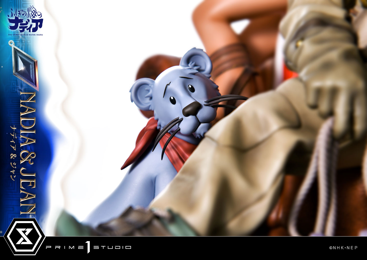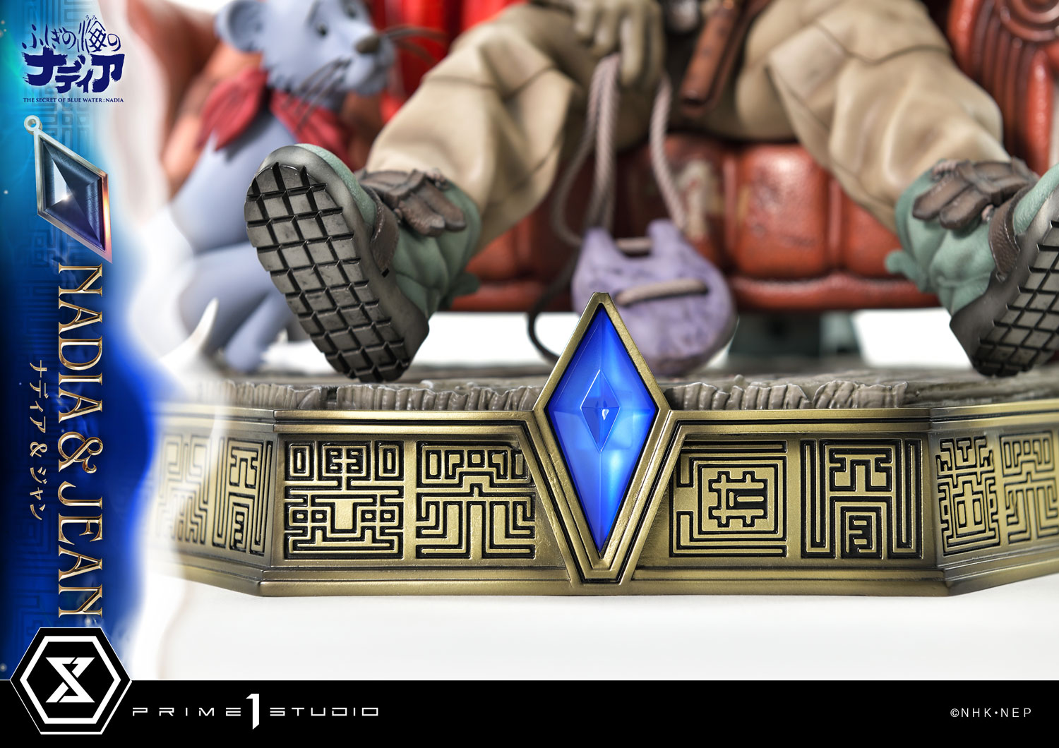 The sculpt and paintwork harmonize the brushstrokes of the original illustration, the charm of the anime, and the depth of a three-dimensional piece. Nadia’s lively skin tone, where orange and white hues create a striking contrast, is carefully shaded to enhance its vibrancy. Jean’s gold-toned diving suit gleams with a muted shine, its loose silhouette expertly sculpted to reflect the body beneath. Their dependable companion, King, is rendered with bold lines and meticulous paintwork, capturing his signature charm from every angle.