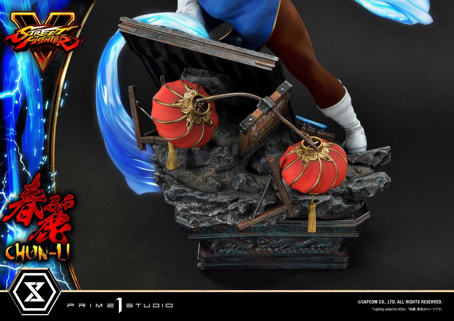 Chun-Li, surrounded by her Critical Art energy, is poised to do some damage atop a China Stage-themed base, complete with a demolished neon sign, Chinese lanterns, and realistic rubble! You can display her fighting against Prime 1 Studio’s PMSFV-01 Akuma or PMSFV-02 Ryu!