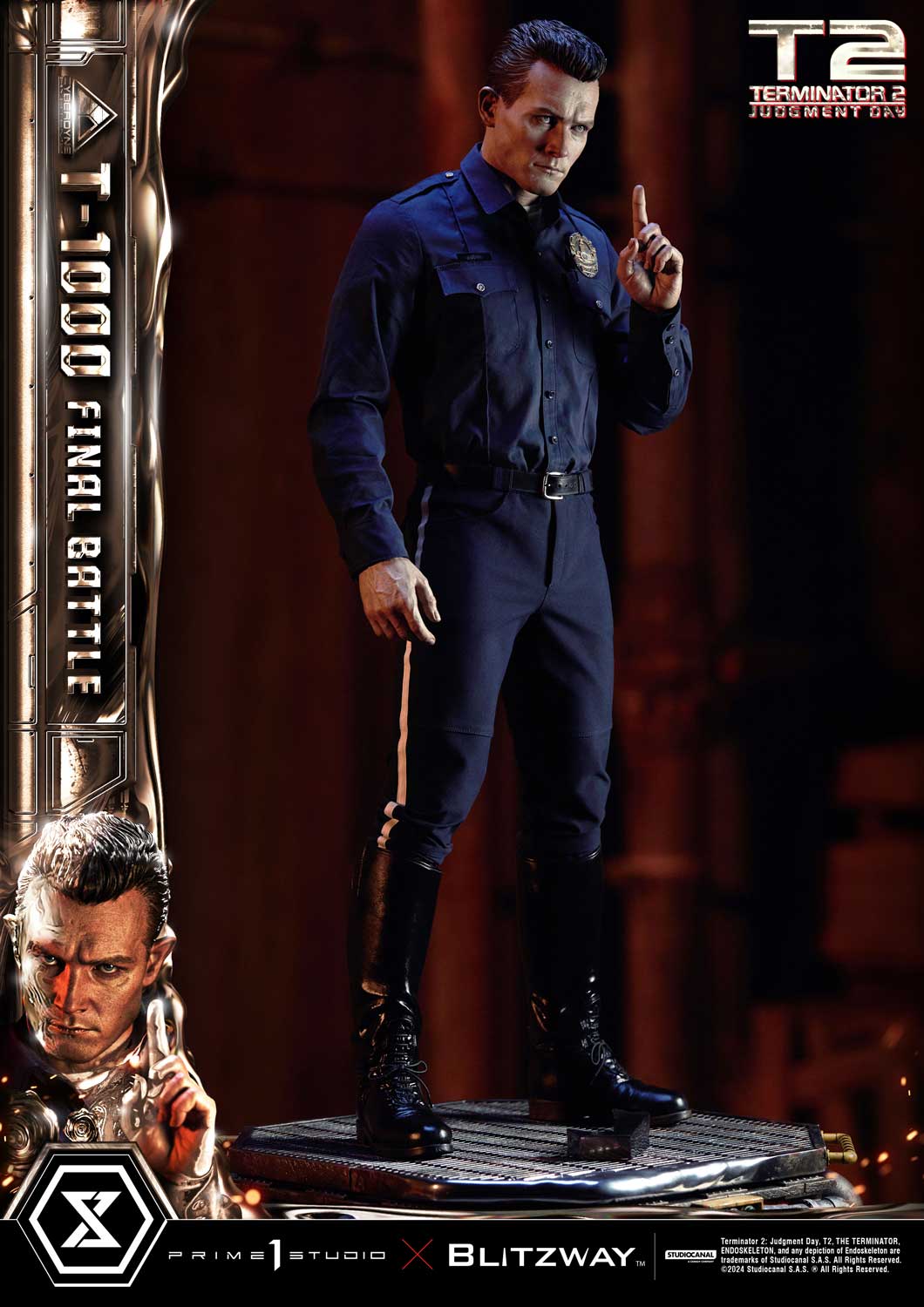 This time, we are taking you back to the climax of the movie, the final battle between the T-800 and T-1000 at the steel mill, bringing you a hyper-realistic screen-accurate depiction of the T-1000. As usual, Blitzway masterfully sculpted this 28.6-inch-tall work of art. Upon its arrival, the T-1000 killed Officer Joe Austin and mimicked his appearance and clothing, and in a similar manner, our artists have done a breathtaking job at replicating the T-1000’s body in this beautiful statue, capturing the intense and stern expression! You could almost see the finger-wagging as he shakes his head in rejection after being shot, as we may have seen, this new prototype is made of liquid metal and takes little to no damage as it can regenerate almost instantly. Resistance is futile! The police uniform, made of real fabric, is meticulously crafted with the greatest attention to detail, from the buttons to the belt and the boot laces. Two swappable right hands are included should you want to display a free hand or one holding a metal rod. T-1000 Final Battle stands atop a steel-factory-themed base that is LED illuminated, a Claw Hook at his feet.