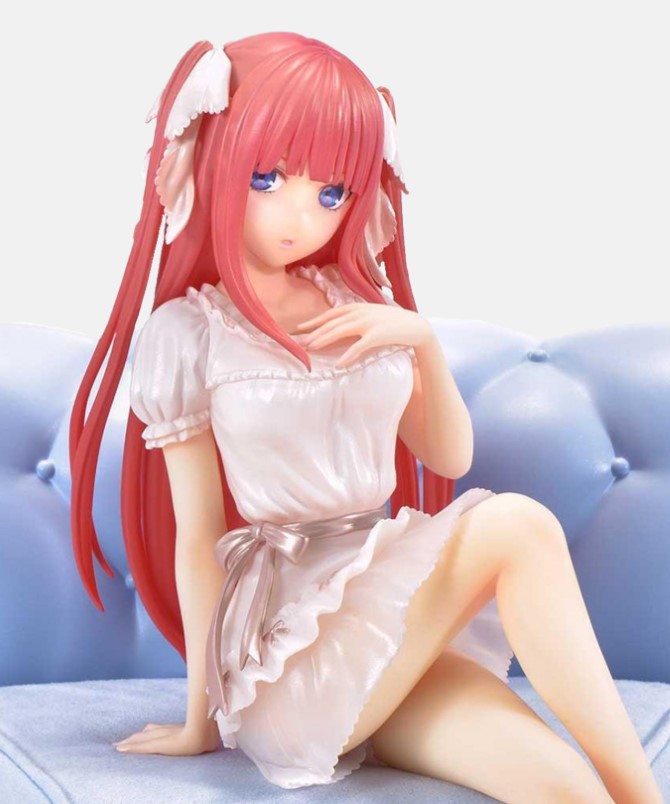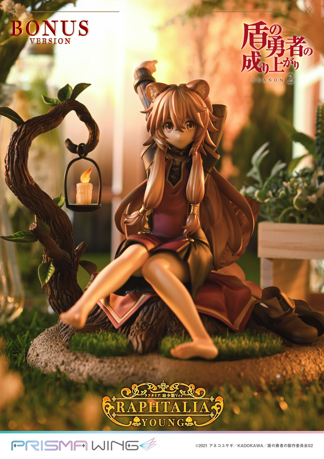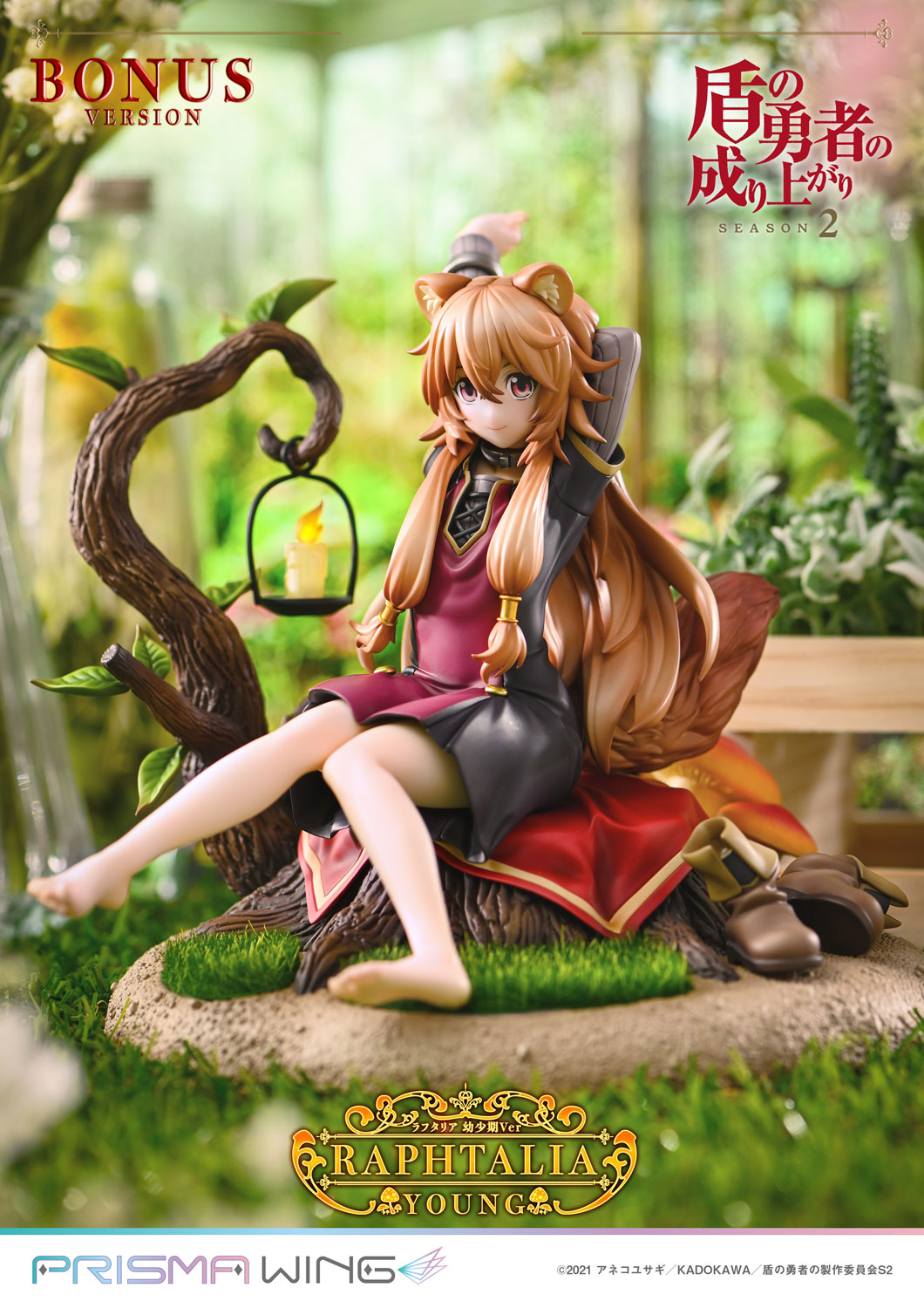 This figure adorably portrays Raphtalia as she sits on a stump, taking off her boots as she stretches tall in a relaxed pose during a candlelit evening on her journey with Naofumi.